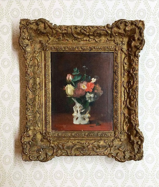A charming 19th century floral still life oil on canvas in its original frame. Indistinctly signed and dated '89 (lower left).