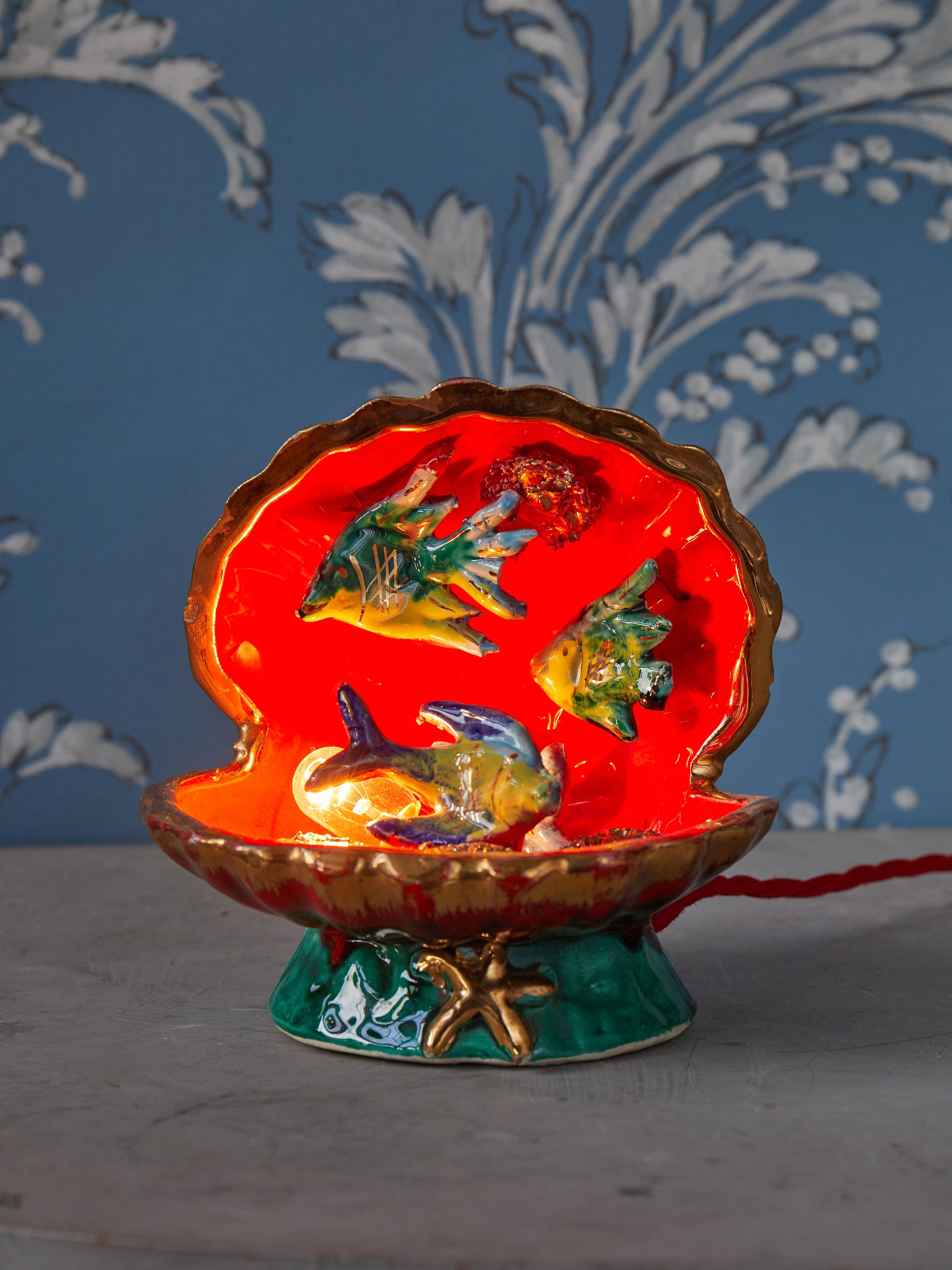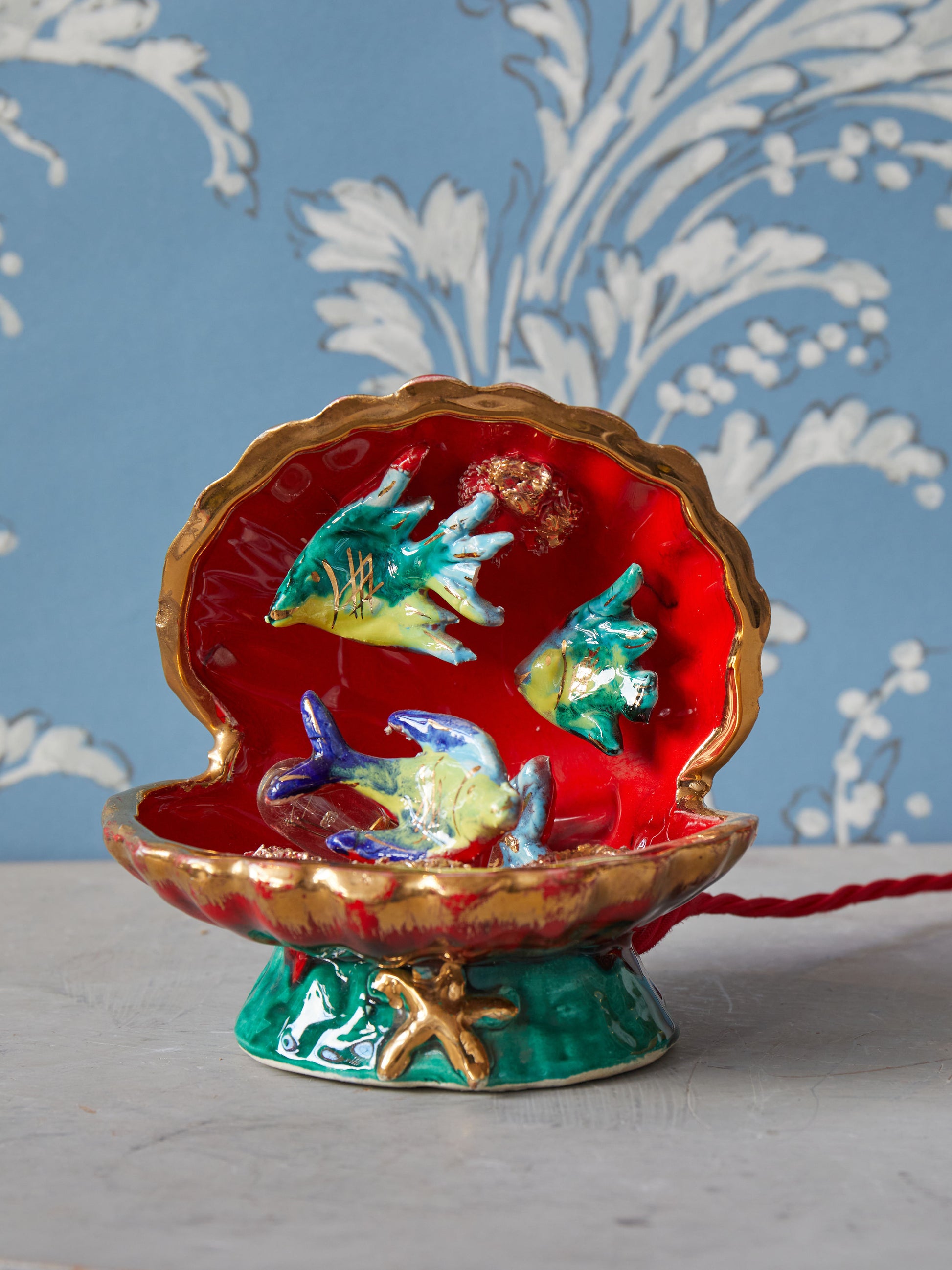 A 1960s Vallauris Glazed Red Shell Lamp with Underwater Scene