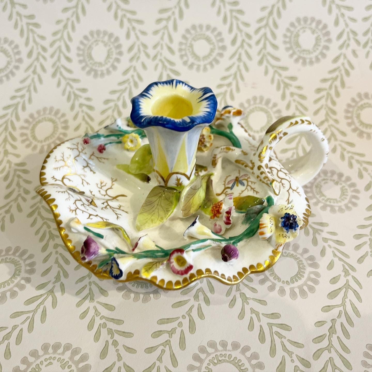 A 'Coalbrookdale' style floral encrusted porcelain candle holder circa 1830s. The candle holder sits on a rococo gilded foot and is in the form of a convolvulus flower with leaves above an undulating gilded dish base featuring handpainted butterflies and a twig-style handle.