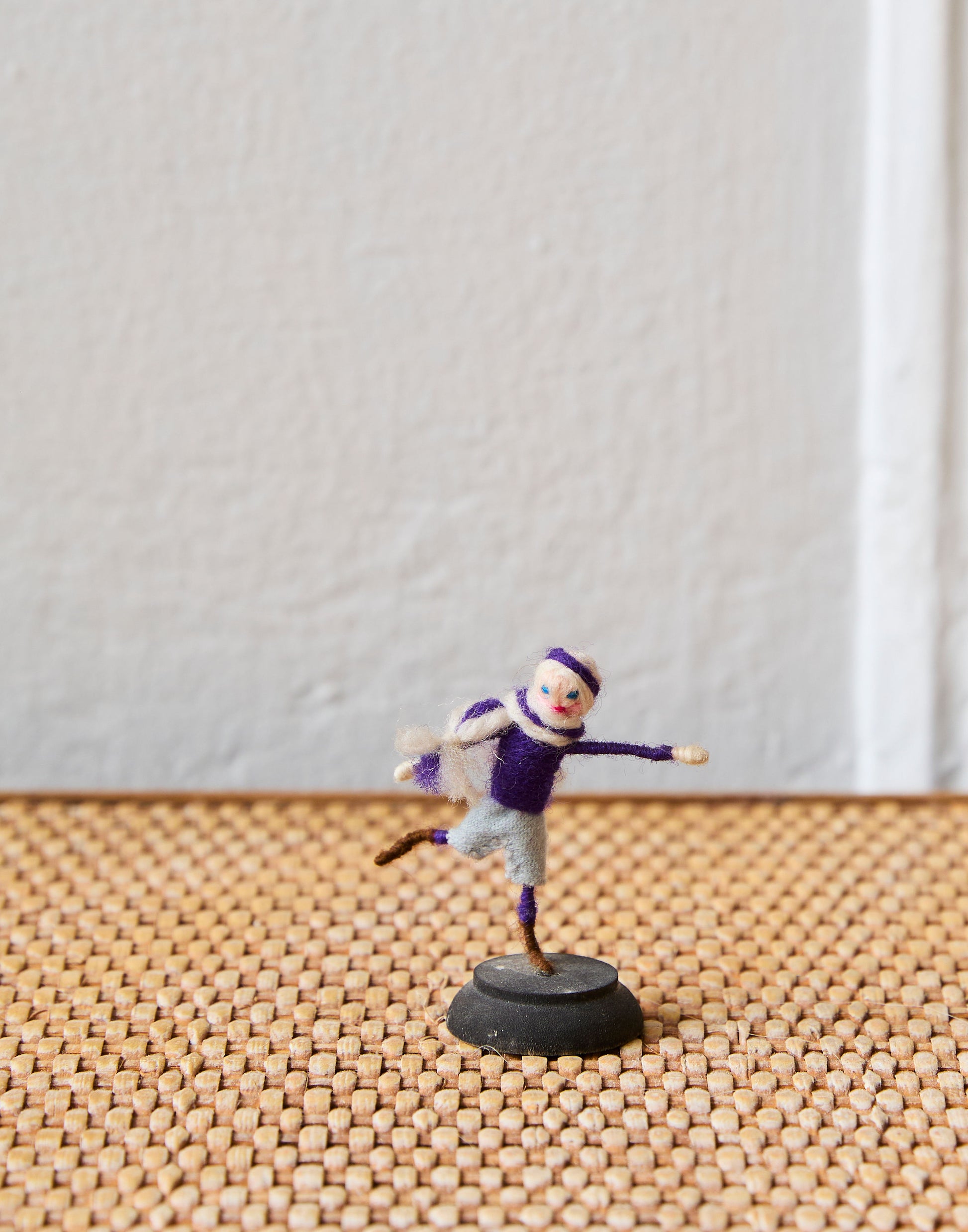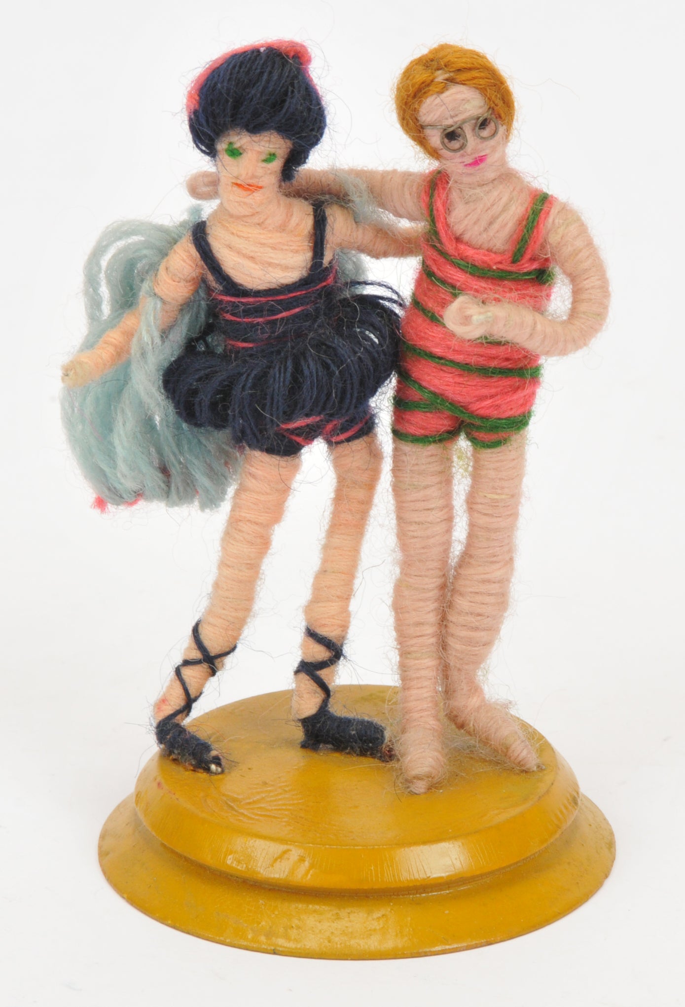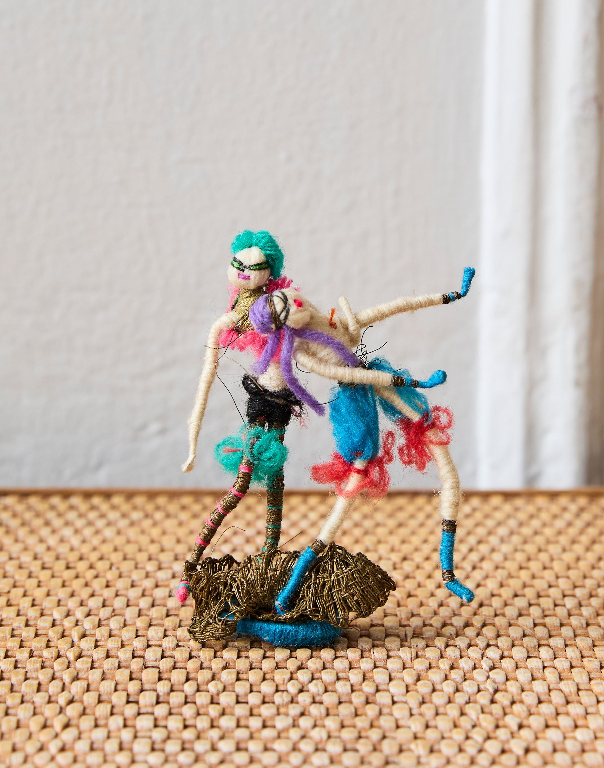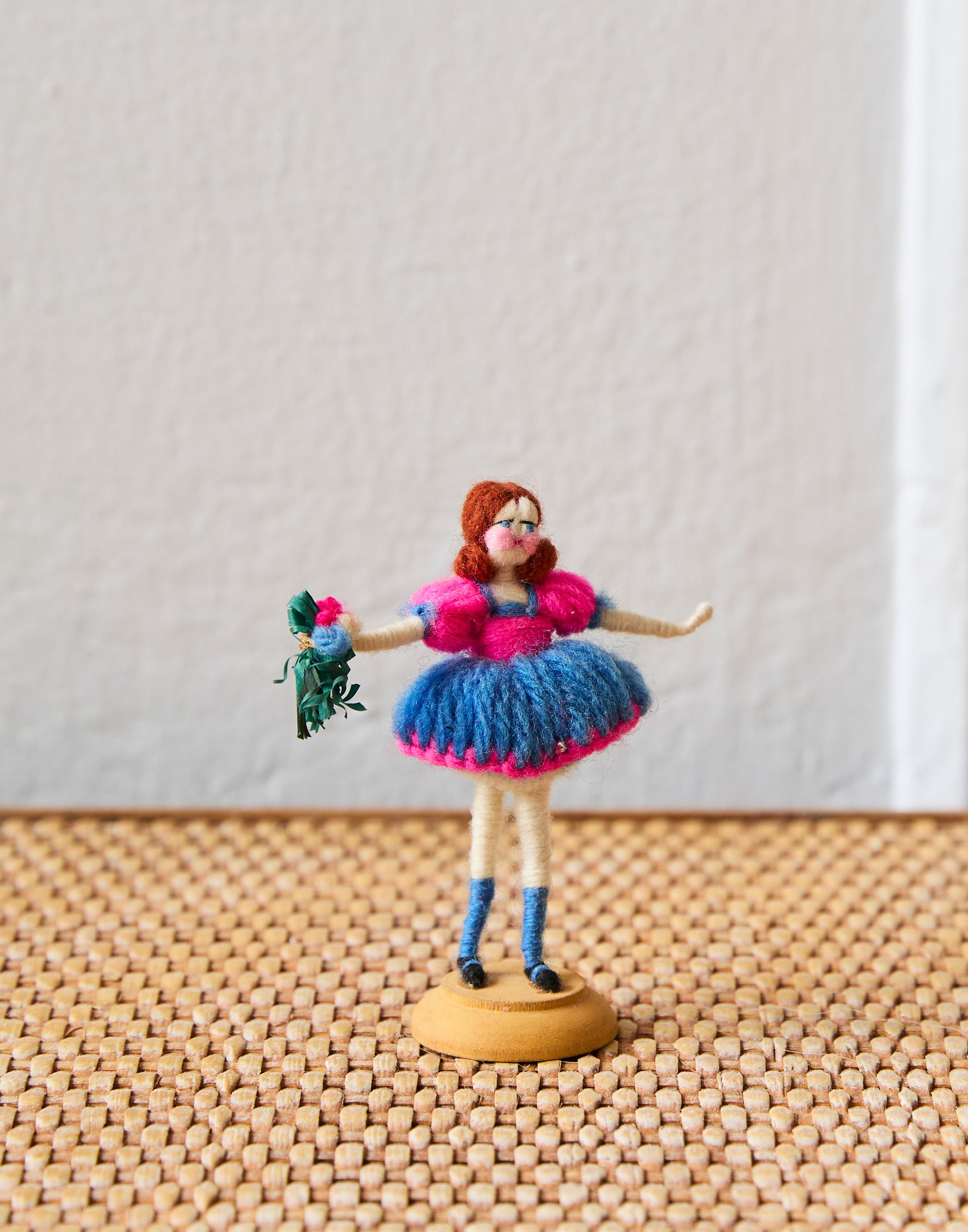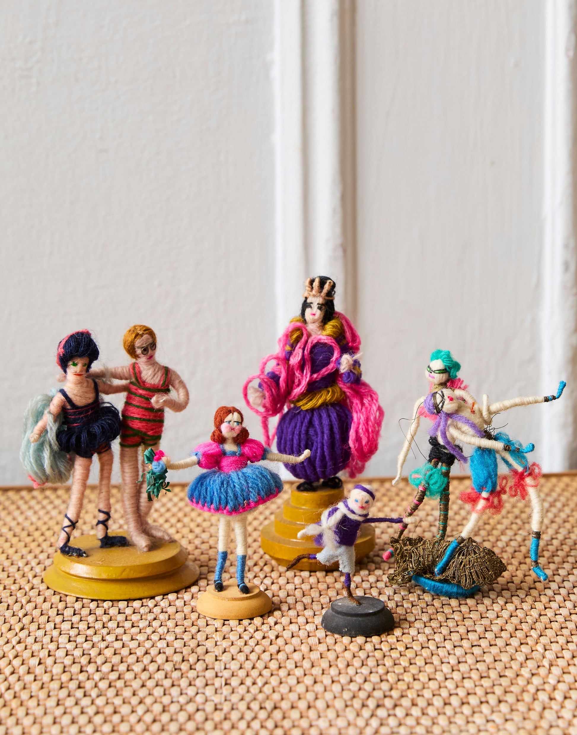 A collection of five rare Grecon miniature cloth dolls made in Germany in the 1920s. They are made of wool-bound wire with cotton faces, embroidered features and woollen wigs.