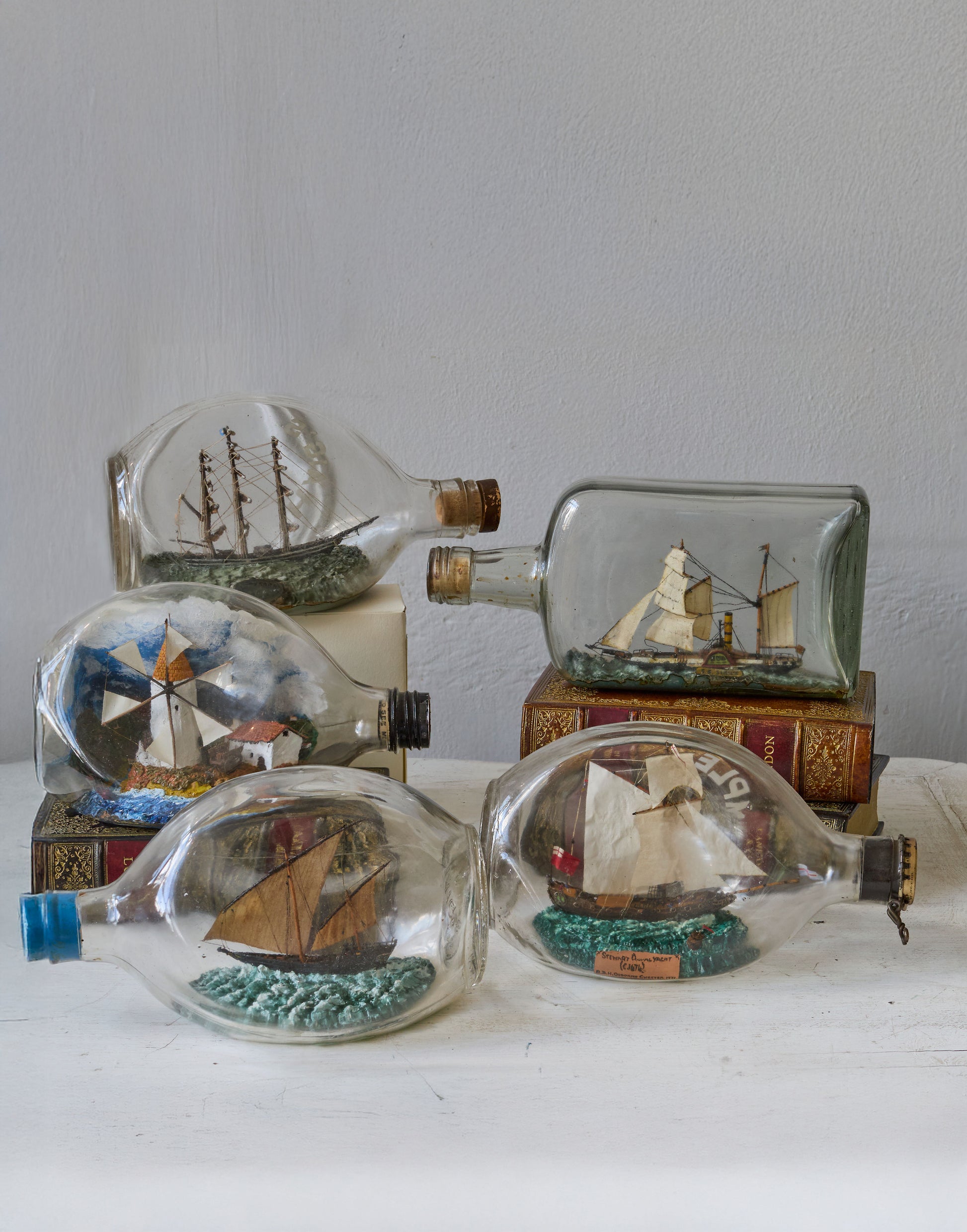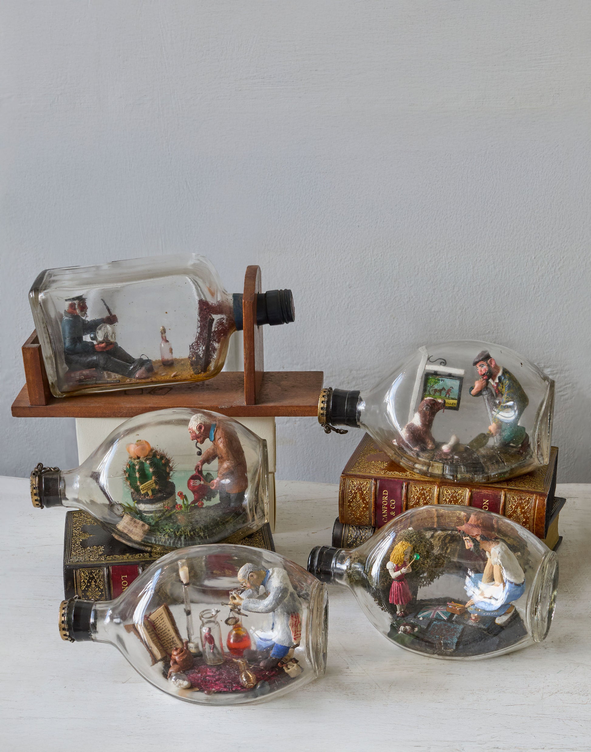 A Collection of Seven Vintage 'Ships in Bottles', each Modelled with Interior Scenes made 1950s-1970s
