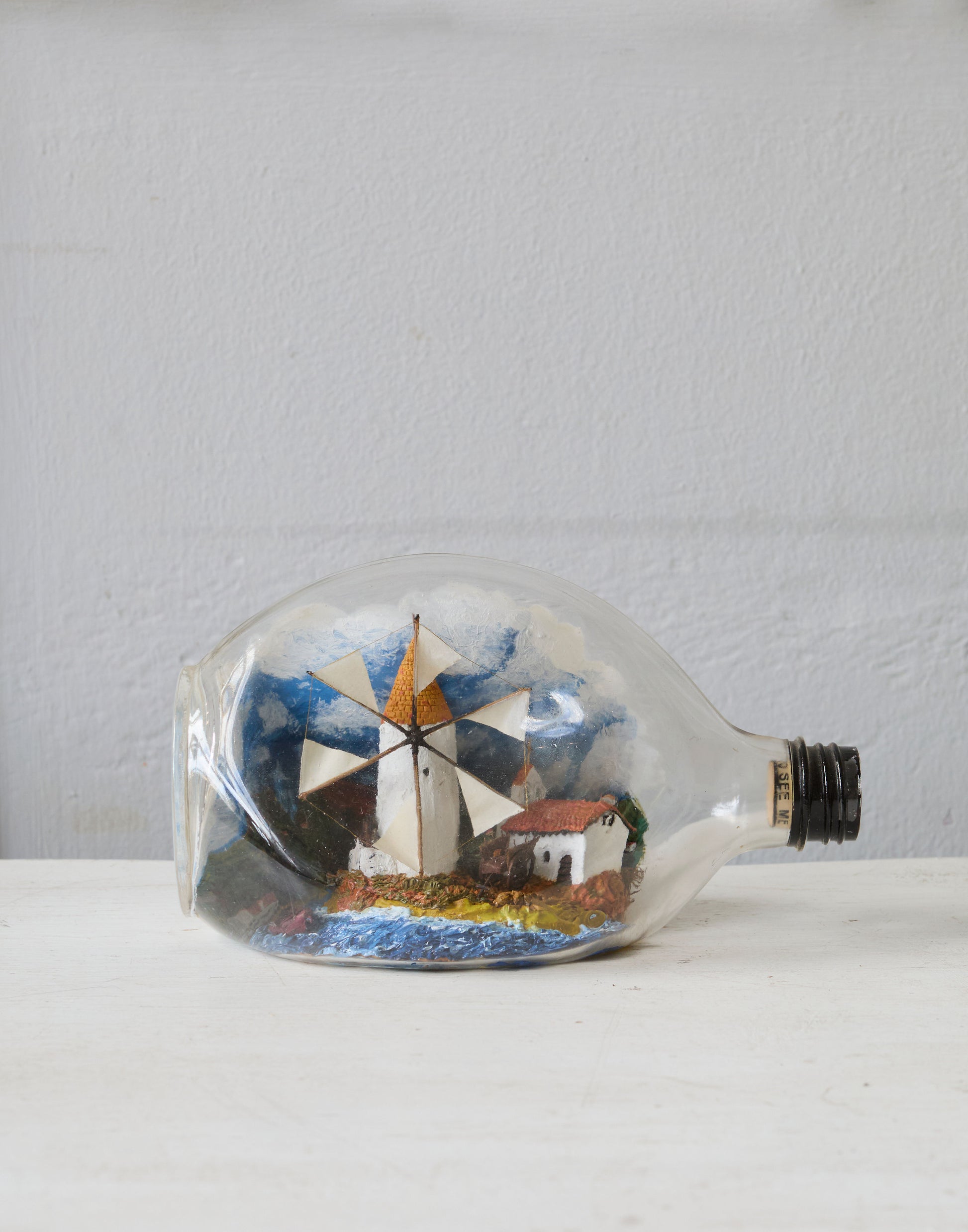Miniature 'Windmill and Church in a Bottle' inscribed and dated Chester 1977 on the base