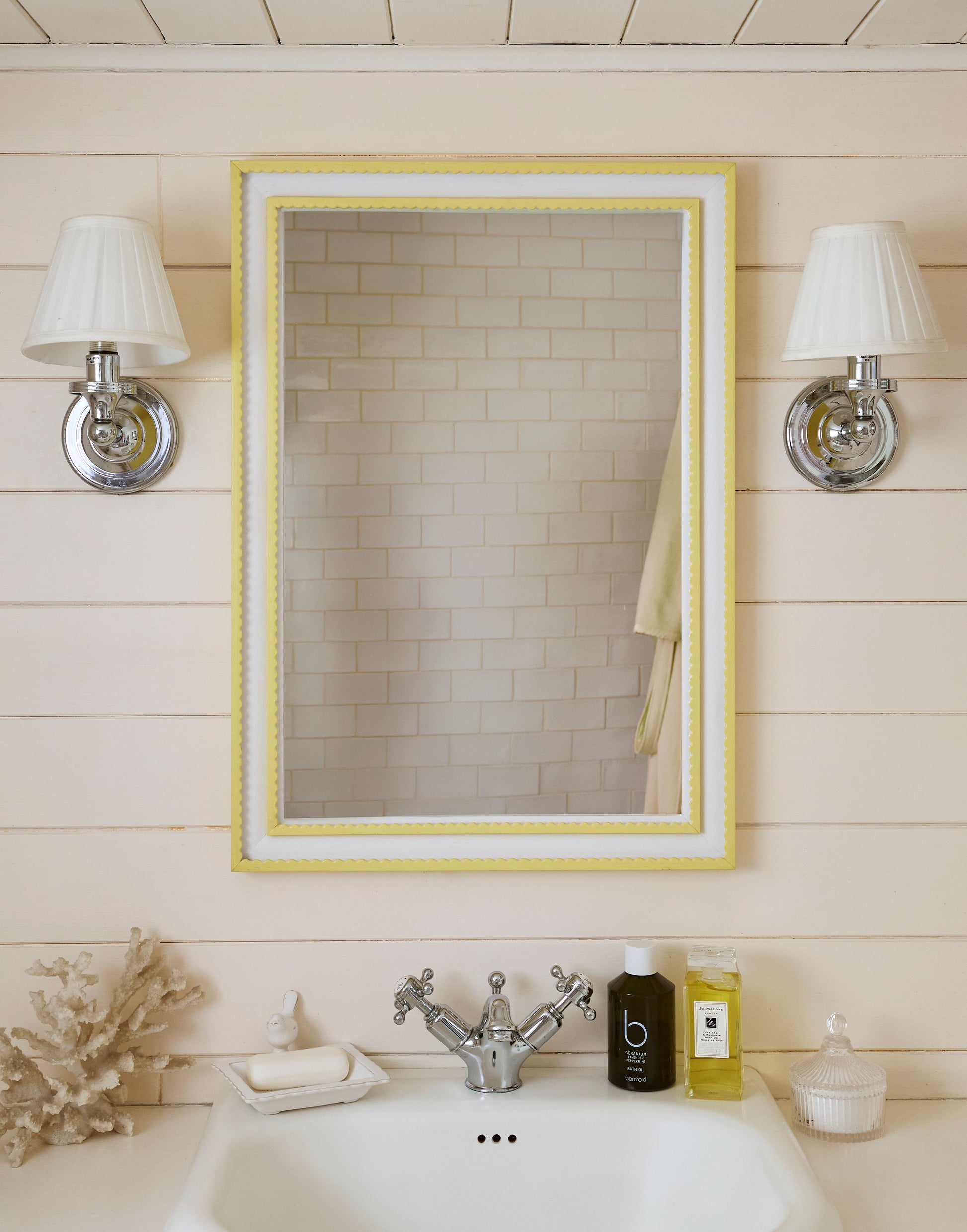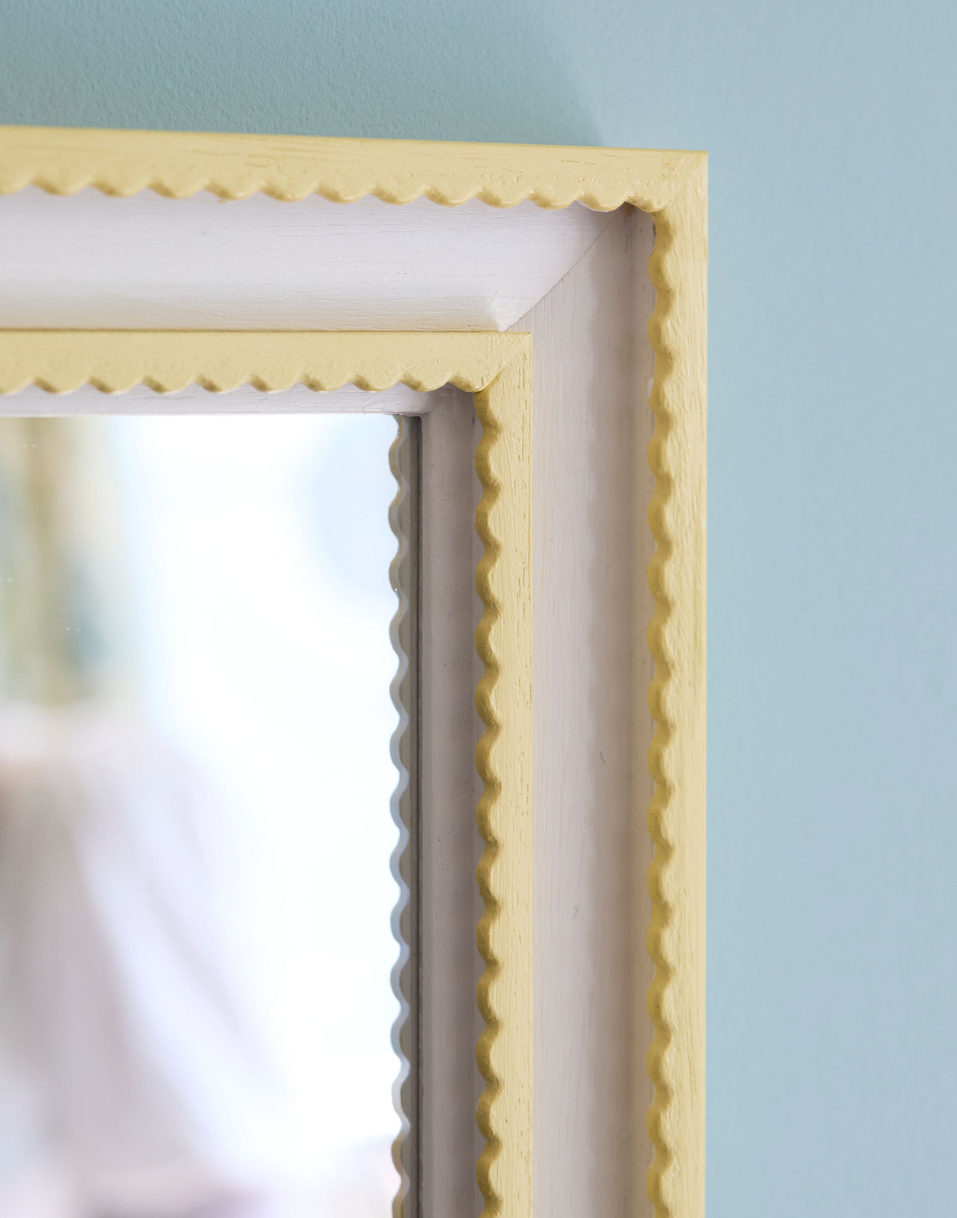 A double scallop Josette mirror handpainted in Farrow & Ball Dayroom Yellow and Wevet.