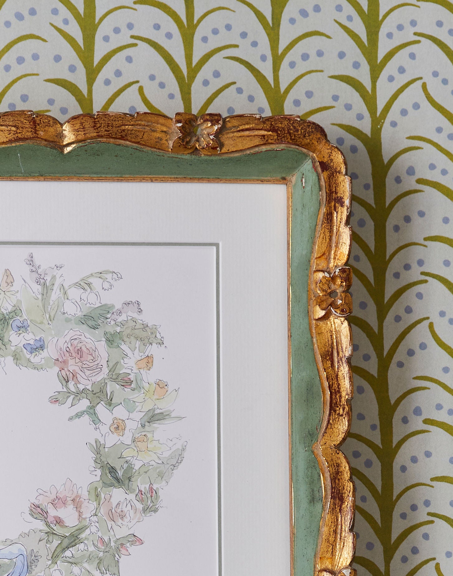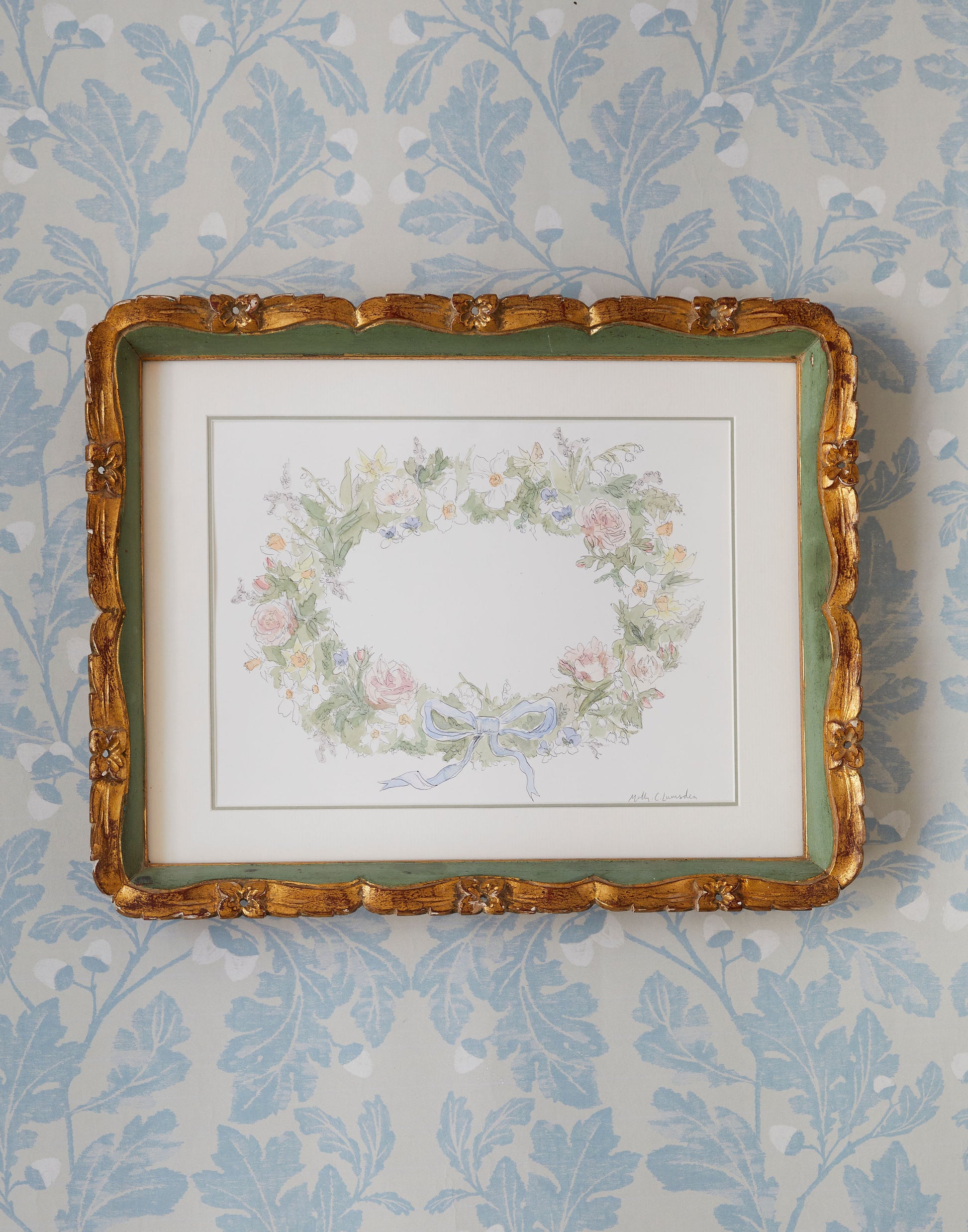 A floral wreath of spring flowers executed in watercolour by contemporary artist Molly Lumsden presented in a double mount with a coloured inner edge and an antique gilt frame and non-reflective glass.
