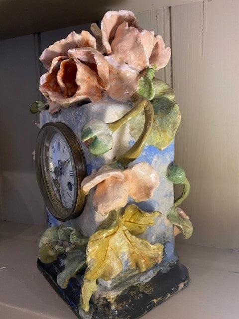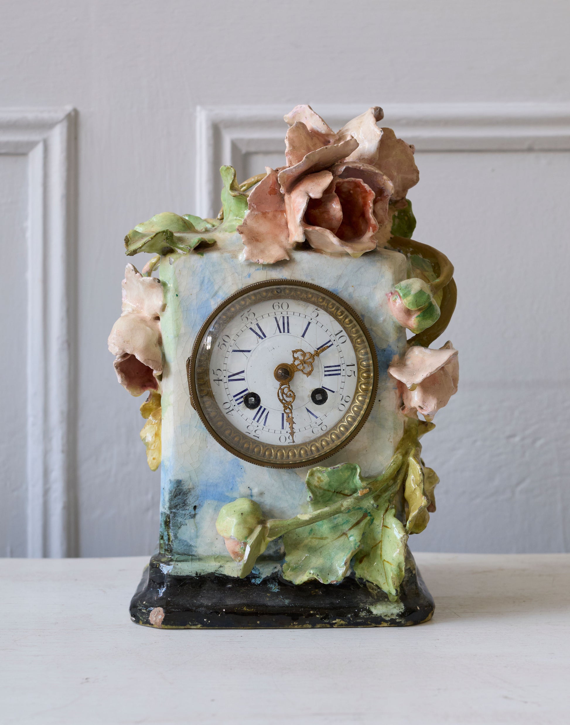 A French 19th century Barbotine Majolica clock with relief floral decoration by Jean-Marie Pointu (1843-1925). Pointu was one of a few ceramicists who fabricated, designed and painted French barbotine in gros relief, particularly floral and foliate relief in the Impressionist style, He used Kaolin clay which was manipulated to a paper thin fineness, formed into layers of floral petals and leaves, coloured and sometimes fired before applying more colours, glazed and fired.