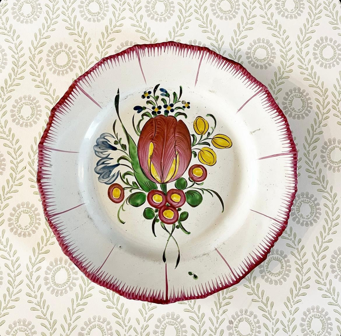 A French faience plate hand-painted with a tulip & other flowers within a feathered rim.