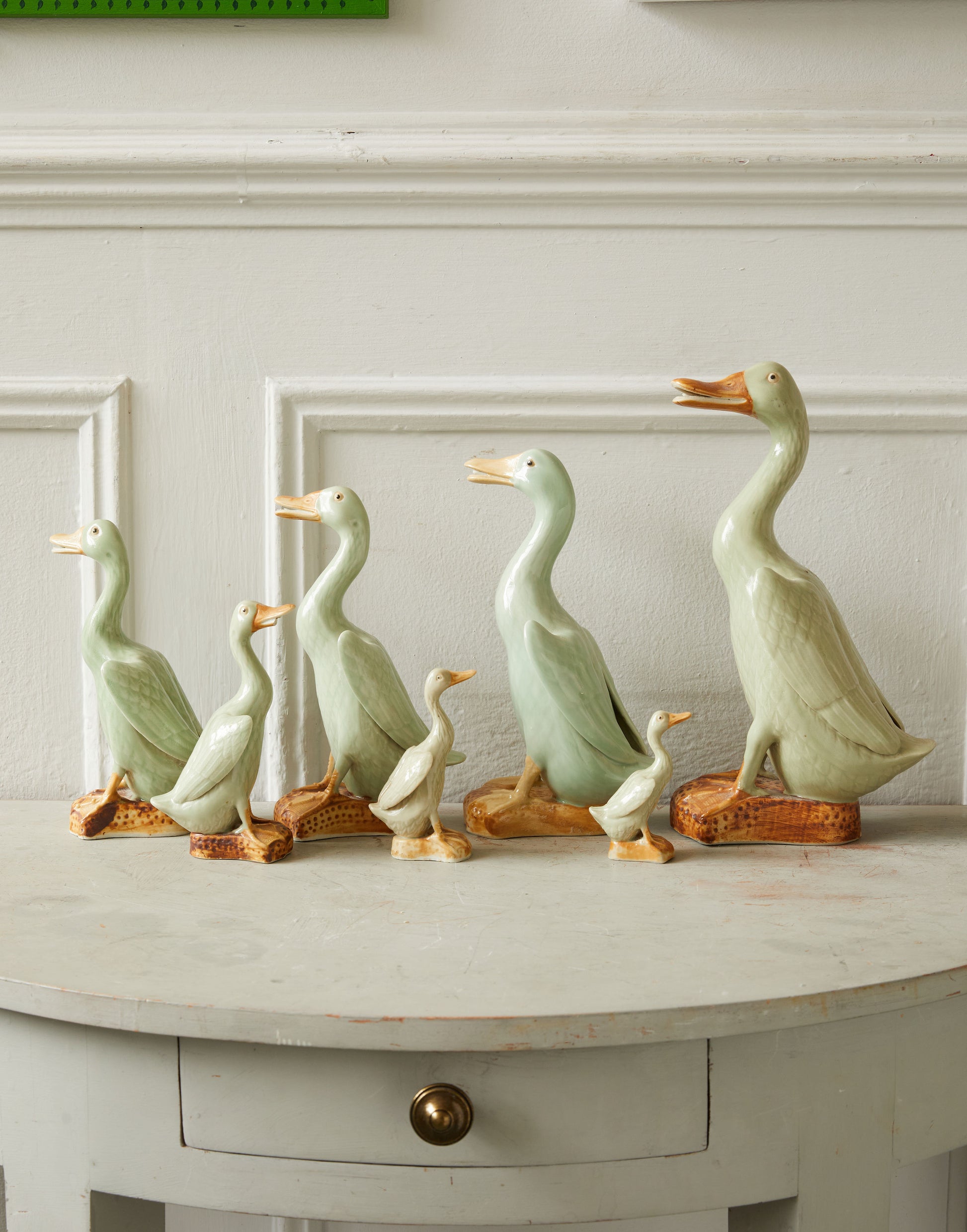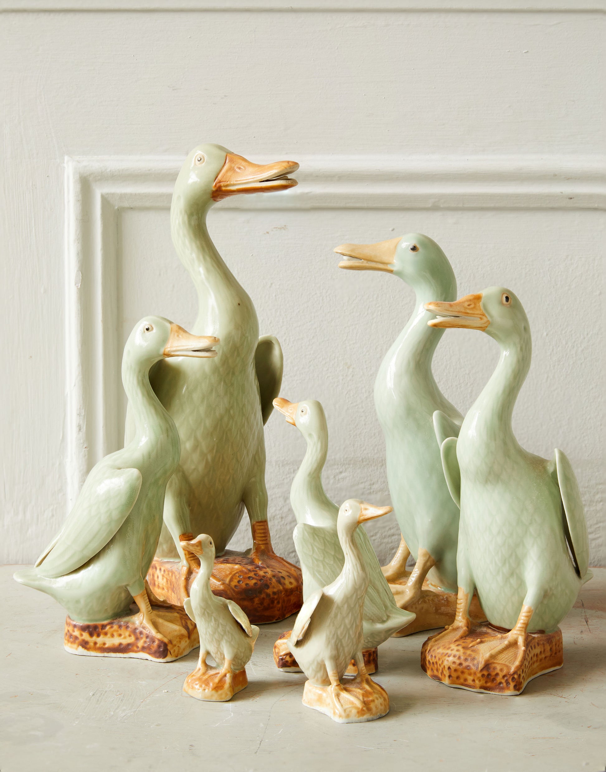 A graduated set of seven Chinese-export celadon glazed figures of standing ducks, Republic period, impressed seal mark to the bases of two. They are beautifully modelled with appealing faces, slightly stretched wings and lovely feather detailing under the glaze. Circa 1930s/1940s.