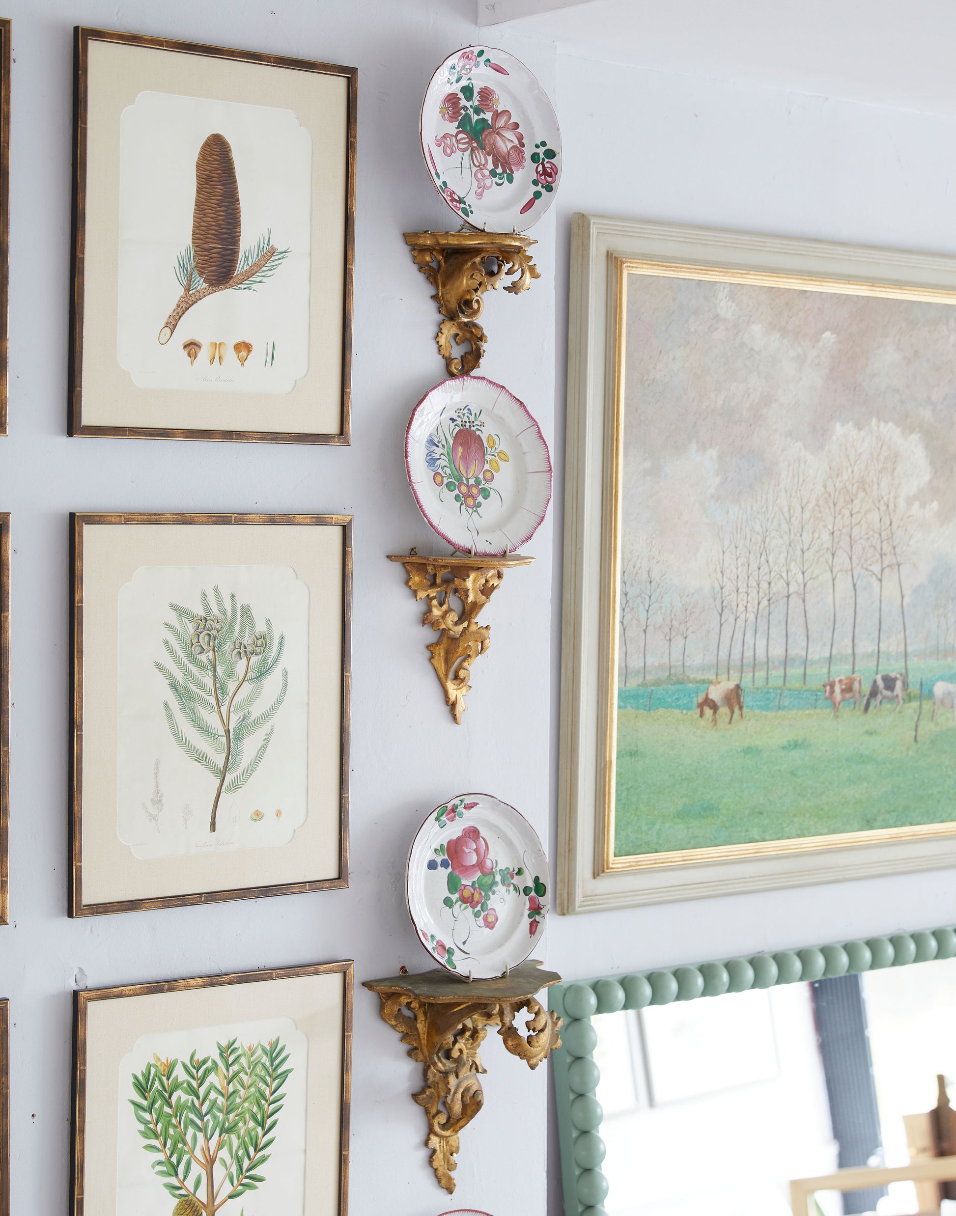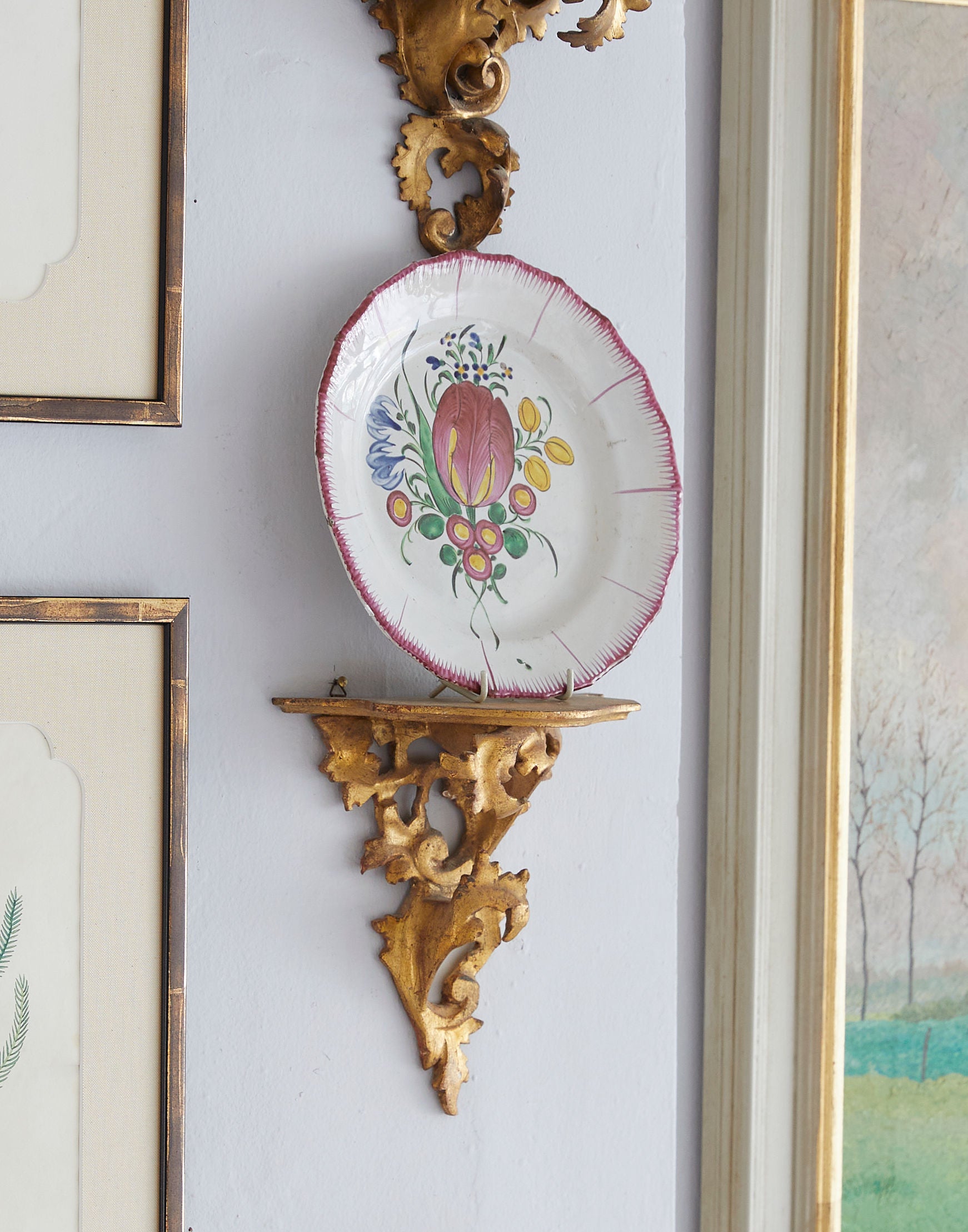 A group of four 20th century Italian carved and giltwood wall plinths all with shaped tops and openwork scrolling foliate carved supports. Ideal for displaying small pictures, china and sculpture. The price is for the set but they are available individually.