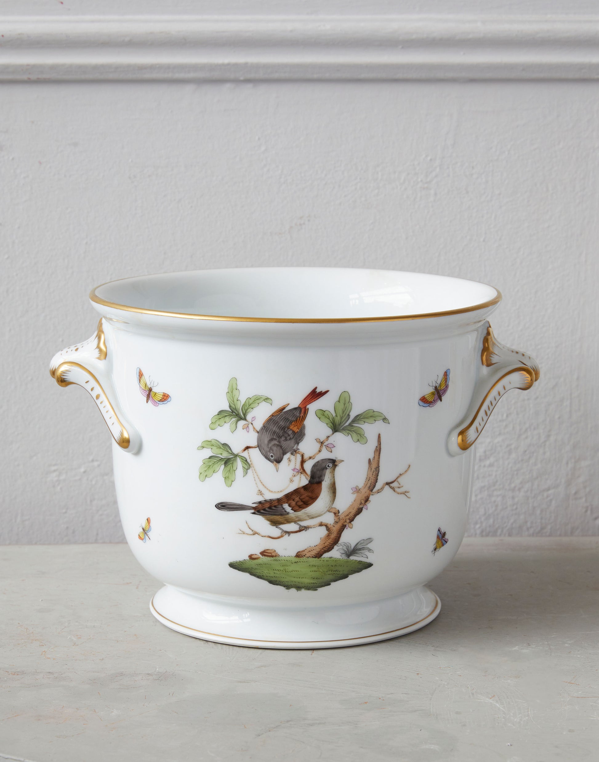 A large 20th century Herend porcelain, gilt and polychrome decorated cachepot with shell form handles and decorated in the Rothschild pattern (7212) of birds and insects with the Herend stamp on the base.