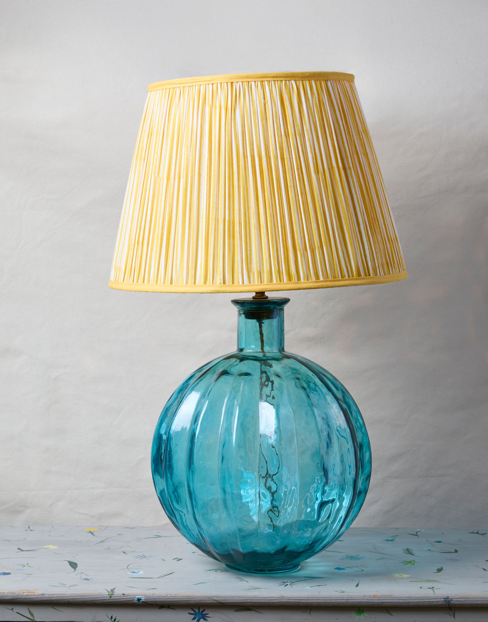 A large vintage blue glass vase which we have converted into a lamp and PAT tested together with a yellow striped lampshade.