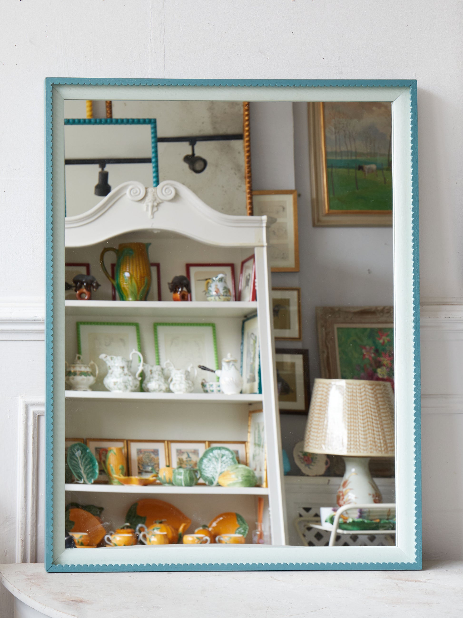 A large scallop framed mirror hand-painted in Tea with Florence and Aquamarine by Little Greene Paint Company.