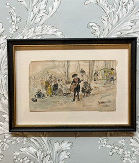 A late 19th Century pencil and watercolour study on paper of The Skating Party signed with initials AEB and dated 1889. It is presented in a linen mount and framed in a black frame with gold inner edge and non-reflective glass.