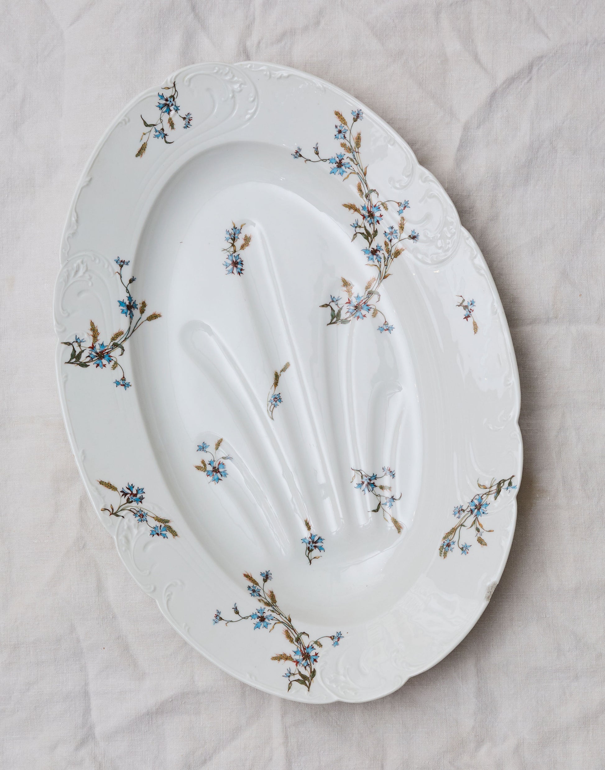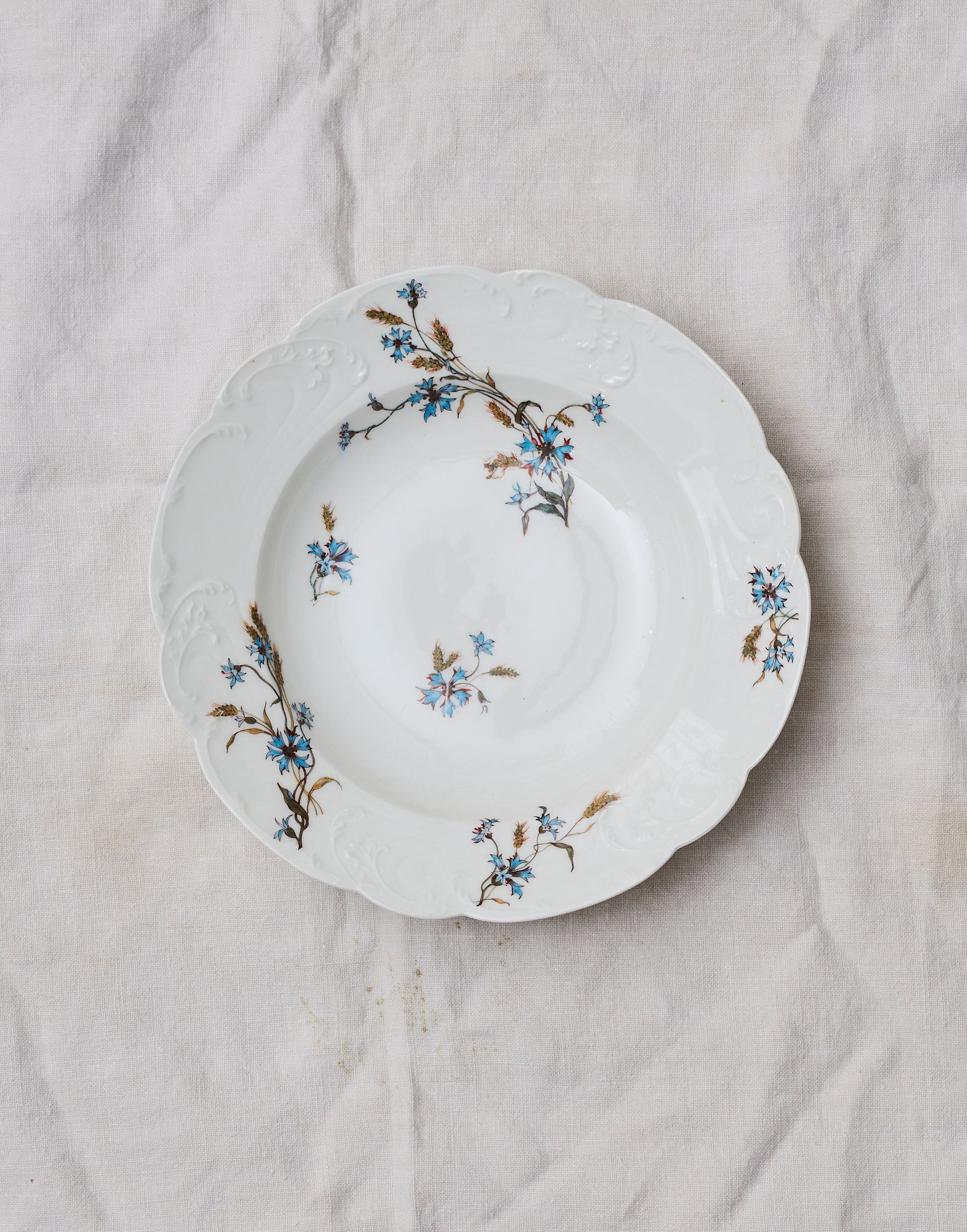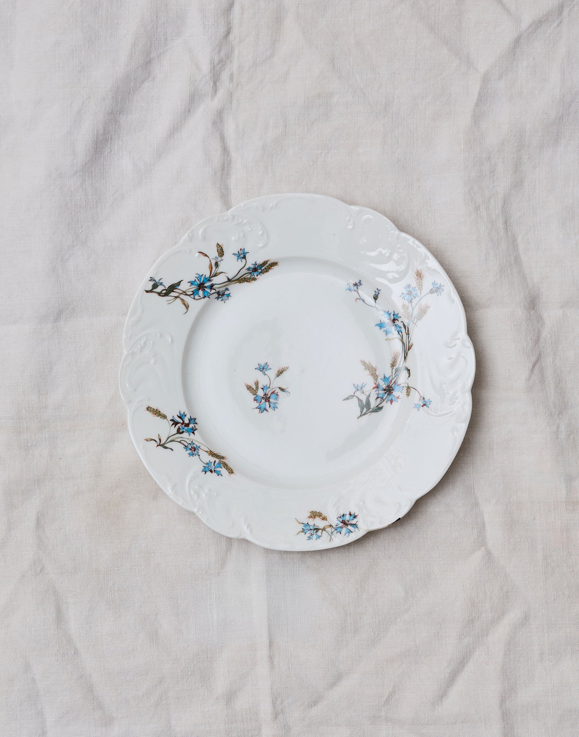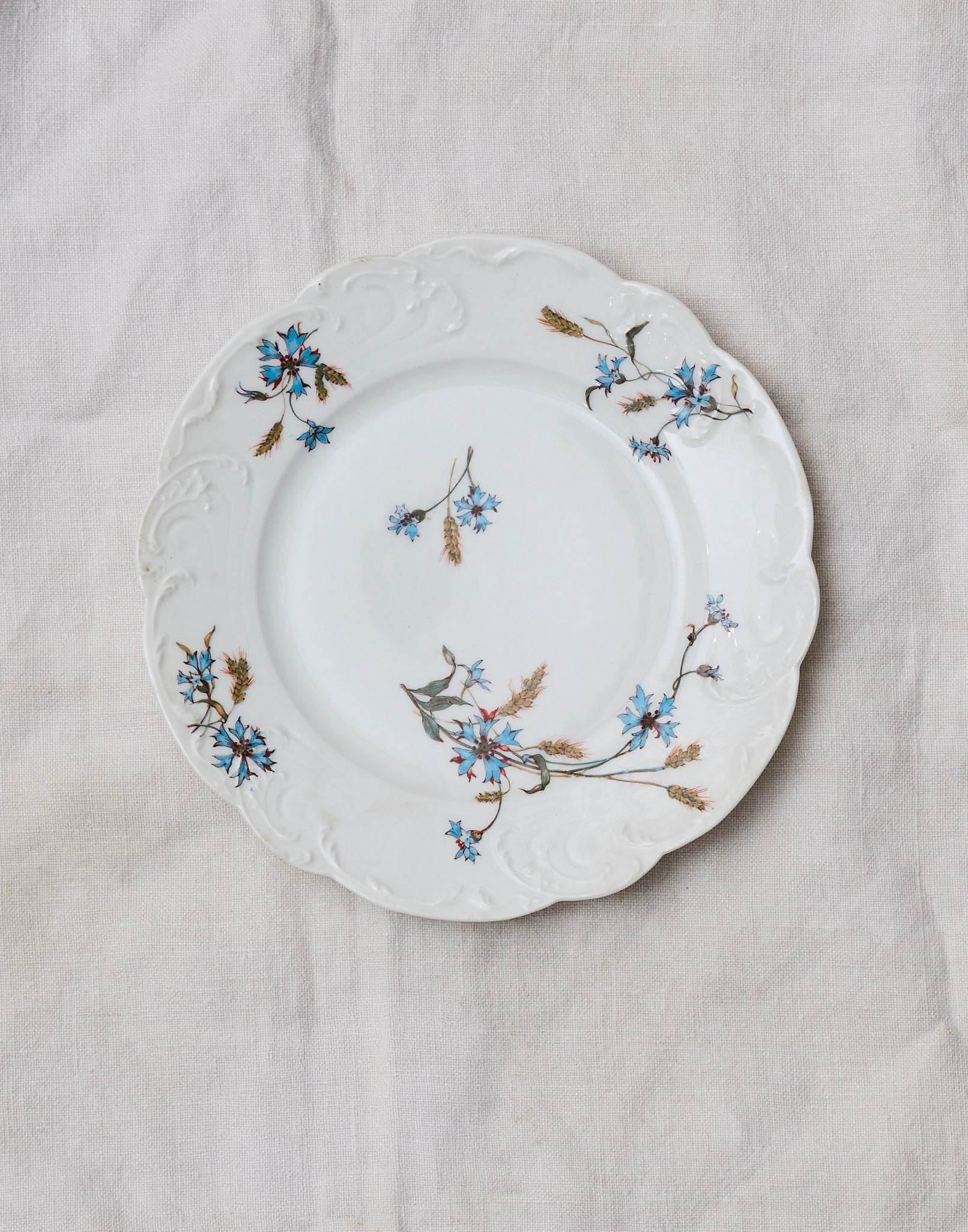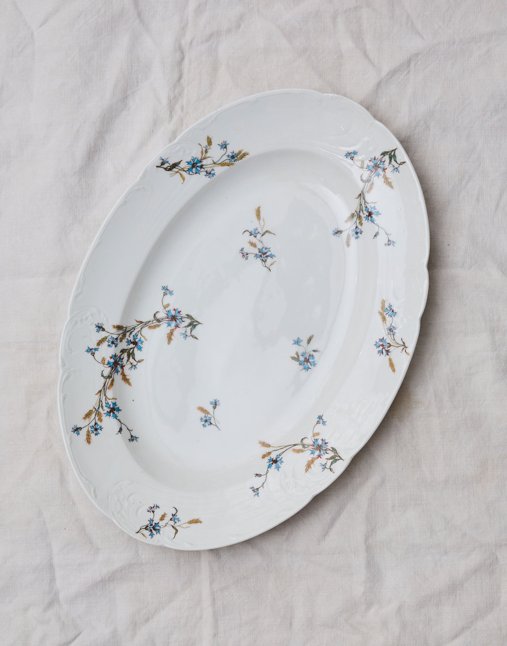 A Limoges part-dinnerware set manufactured by Haviland & Co for HG Stephenson Manchester including six dinner plates, ten soup bowls, four side plates and two oval meat platters, each decorated with blue cornflowers.
