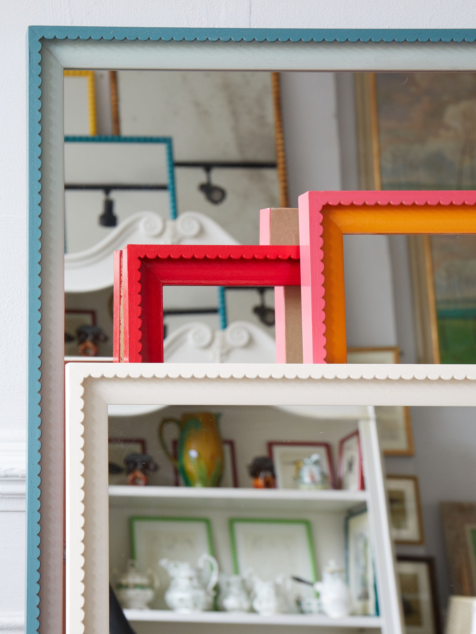 We can make our scallop frame mirrors (exclusive to Canford) to order, in any size and hand-painted in one or two colours, with a gloss or wax finish. Please email us with a size and we will send a quote. Production time is 3-4 weeks.