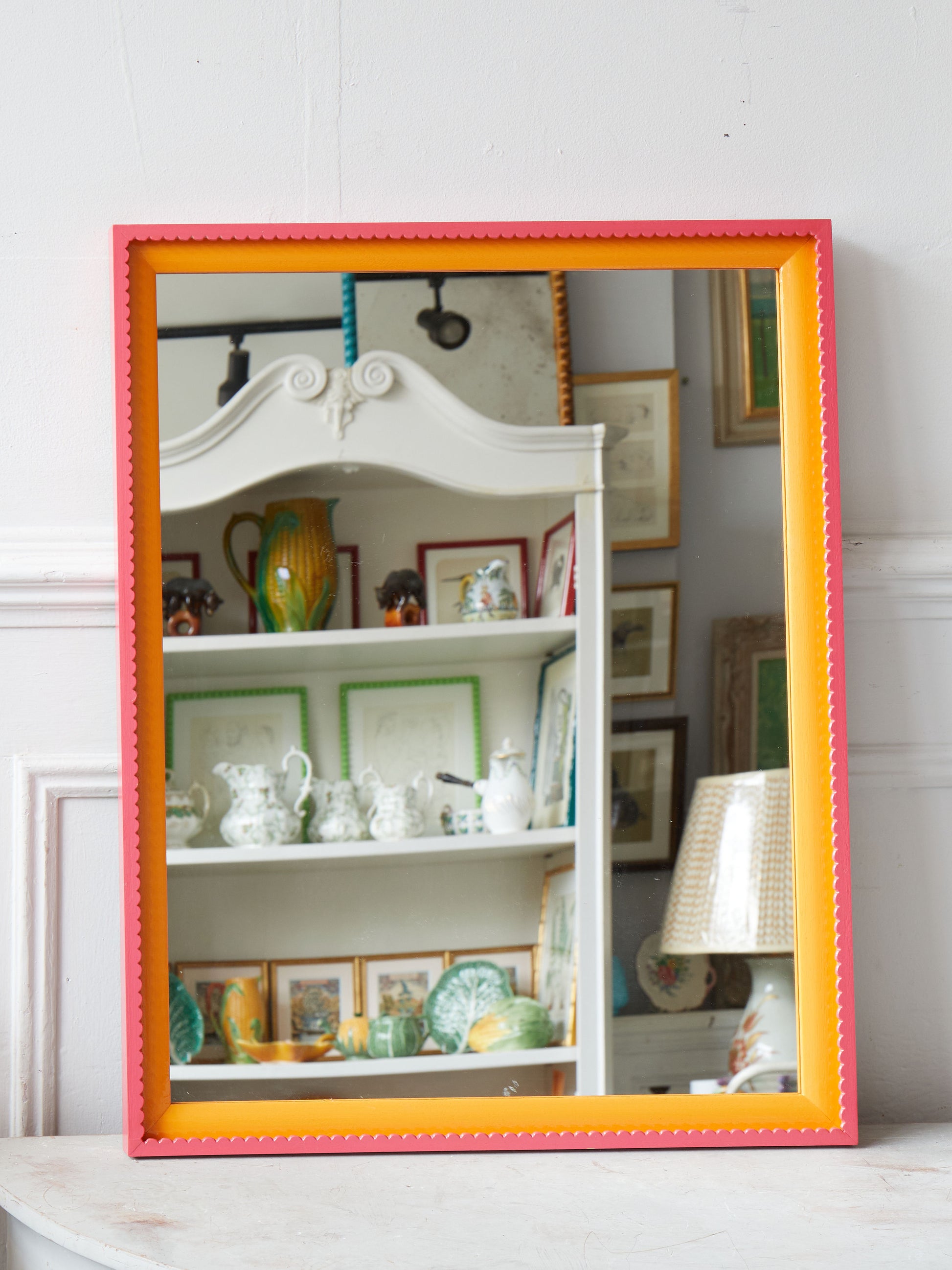 A medium scallop framed mirror hand-painted in Leather and Marigold by Little Greene Paint Company.