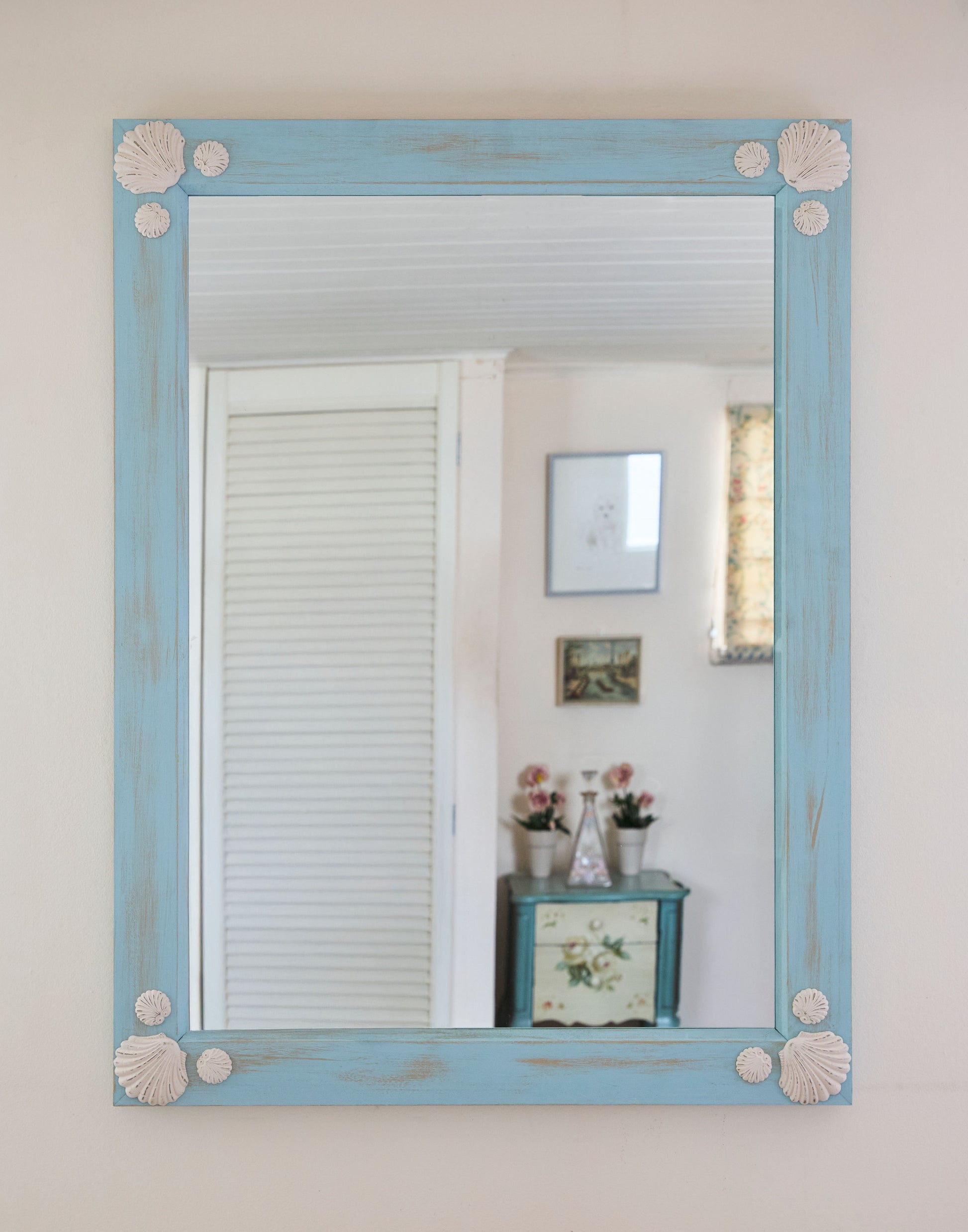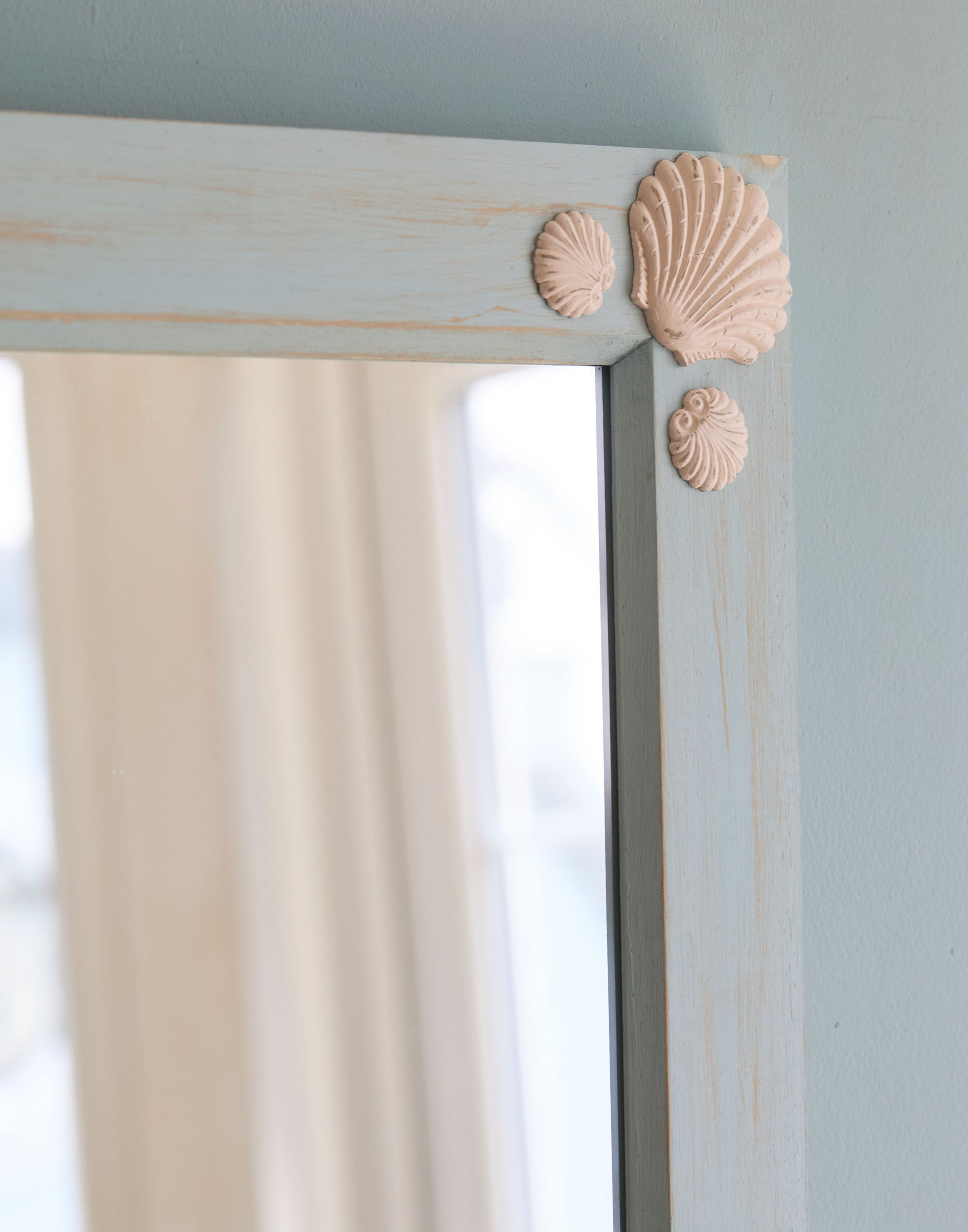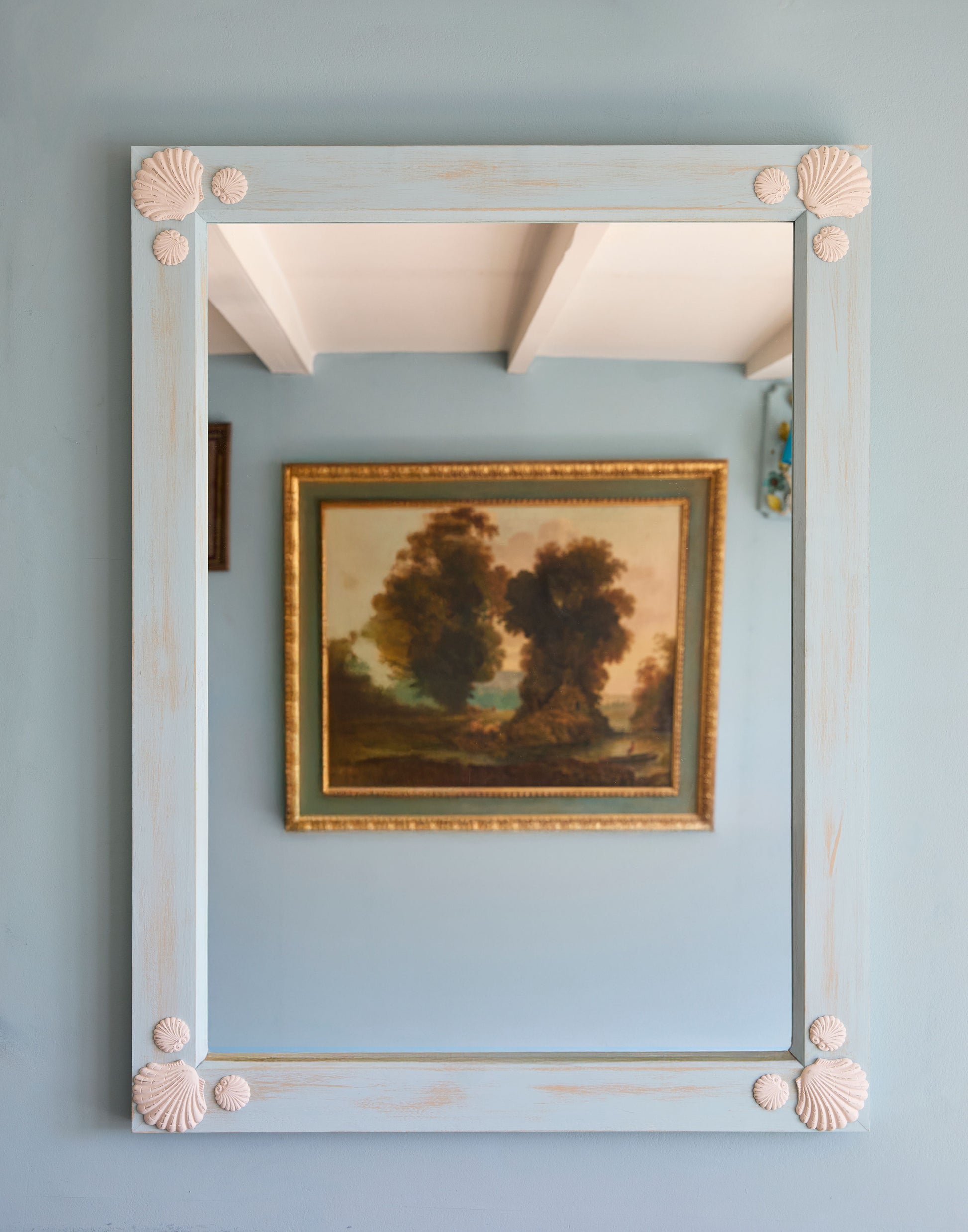 A Mirror with Shell Decoration Handpainted in Little Greene Brighton with a Distressed Finish