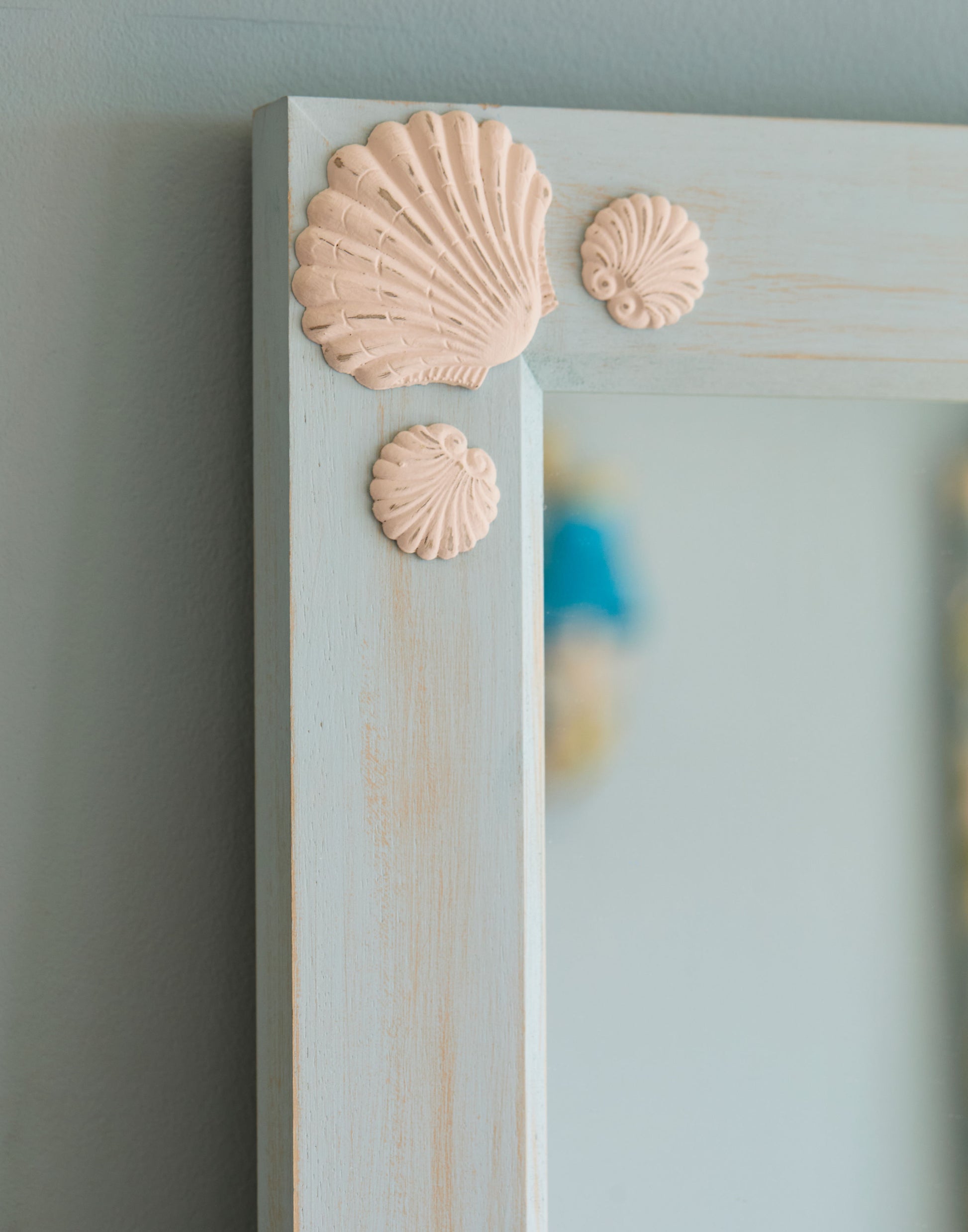 A handpainted mirror decorated with shells. The frame is painted in Little Greene Brighton and the shells are painted in Julie's Dream with a distressed finish.