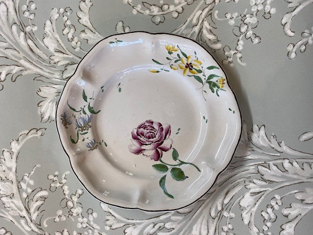 An extremely rare French Faience charger hand-painted with a pink rose and sprays of blue and yellow flowers by Joseph Hannong in Strasbourg circa 1770. The border is moulded with slightly lobed panels and painted dark brown. French faience of this type was used at the court of Louis XV. The underside is marked in under glaze blue with Joseph Hannong''s interlaced "JH" cypher over "155".