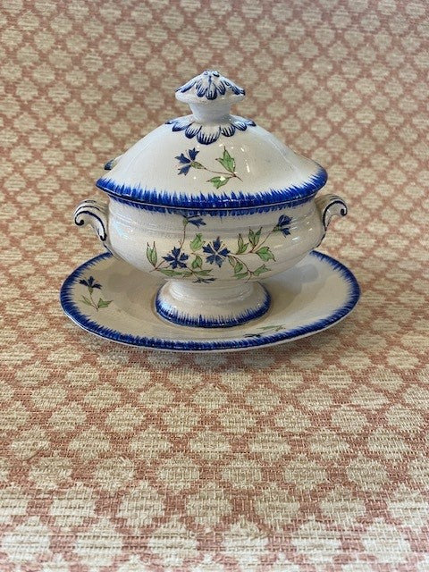 A rare ironstone ware mid 19th century French tureen sauce pot with handles and a filial by Creil & Montereau. It is hand-painted with the cornflower or Barbeau pattern popularised by Marie-Antoinette. It bears the maker’s mark and is stamped Barbeau, Deposé, Terre de Feu.