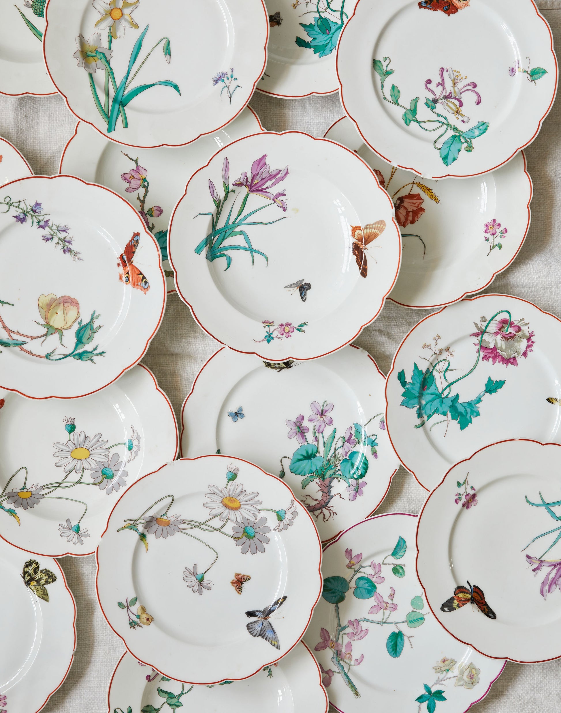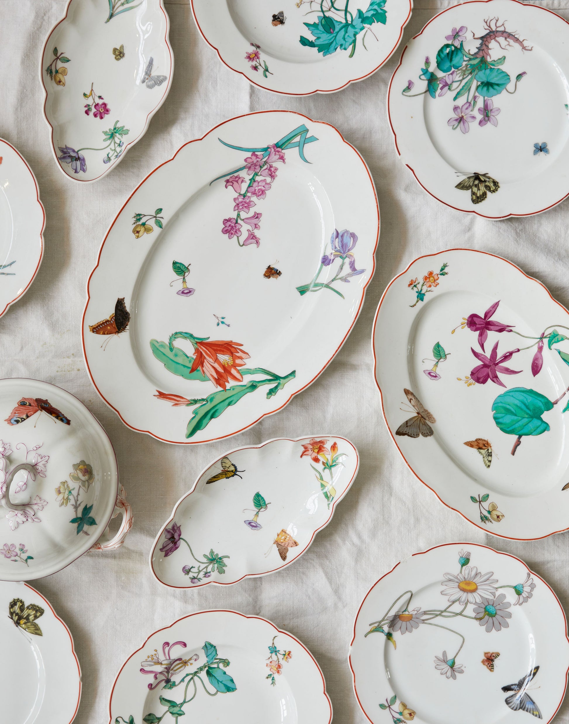 A very pretty selection of mid 19th century Louis Aimé Césaire Macé Sevres porcelain with scalloped edges and decorated with transfer decoration of butterflies, flowers, and foliage, Macé is said to have been the inventor of the process of transferring chromolitographies onto porcelain and faience in 1847.