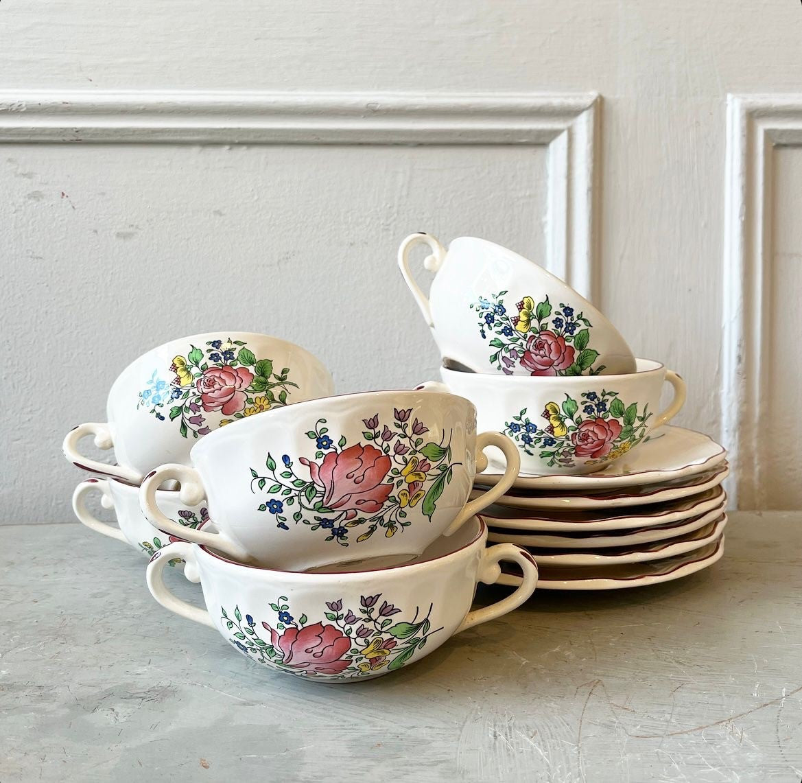 A set of six antique French Lunville Old Strasbourg soup bowls and saucers with maker's mark on the base. The price is for the set.