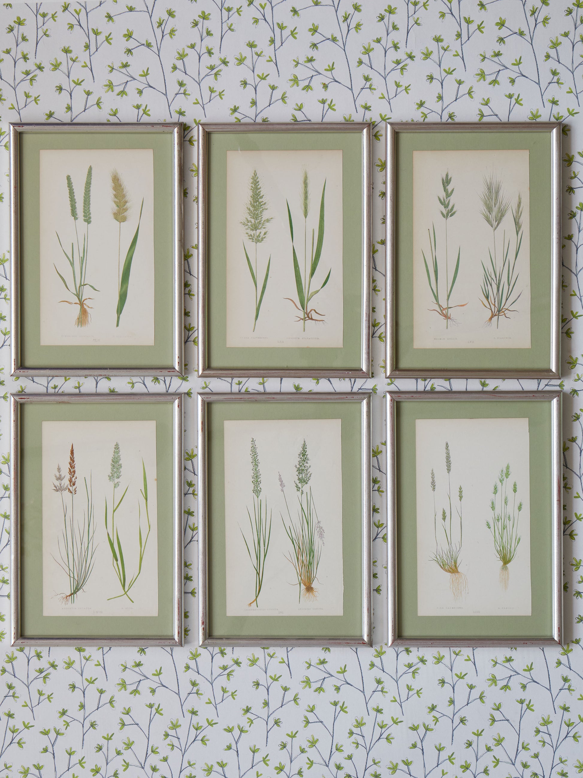A set of six antique prints of grasses, presented in green mounts and distressed silver frames.