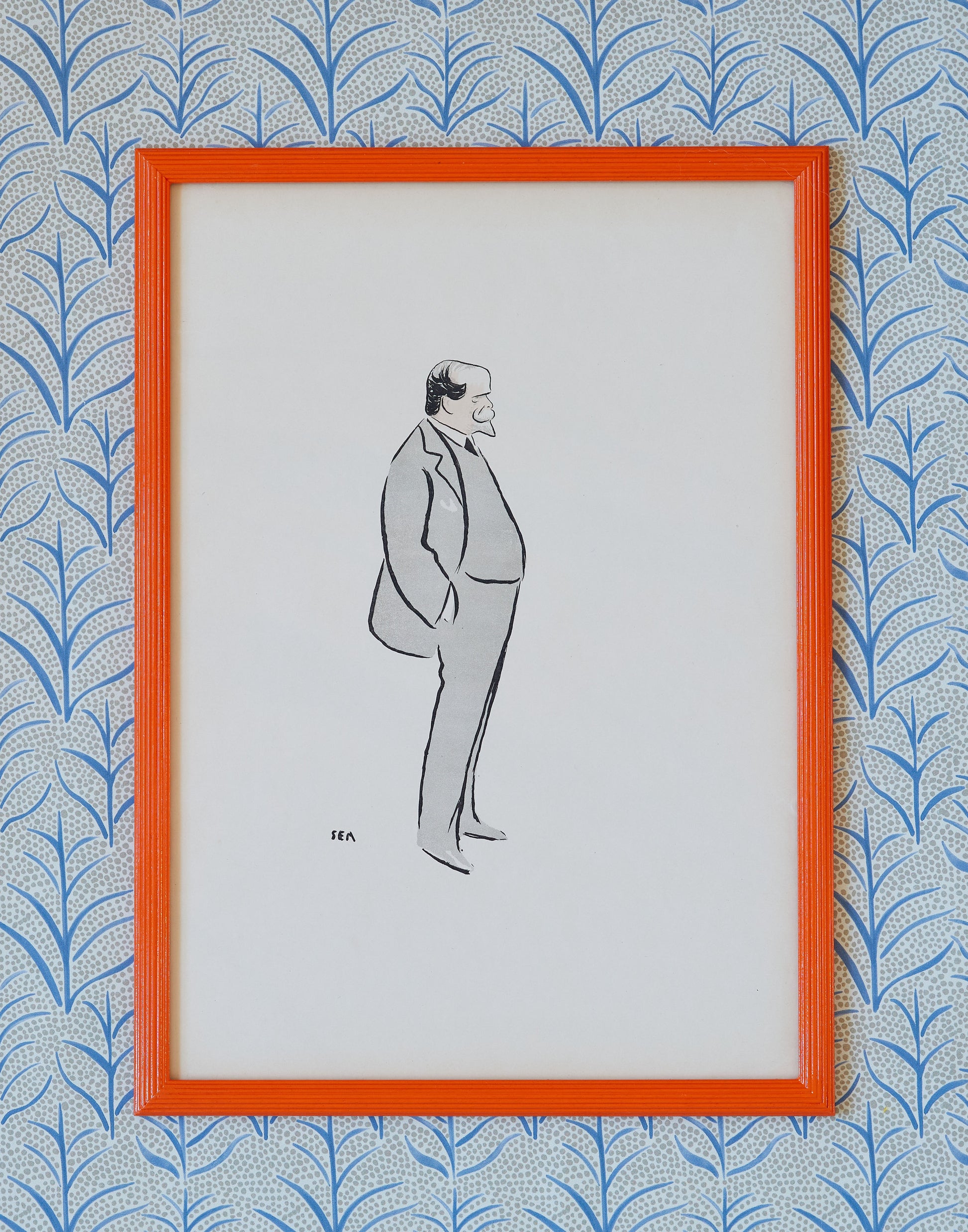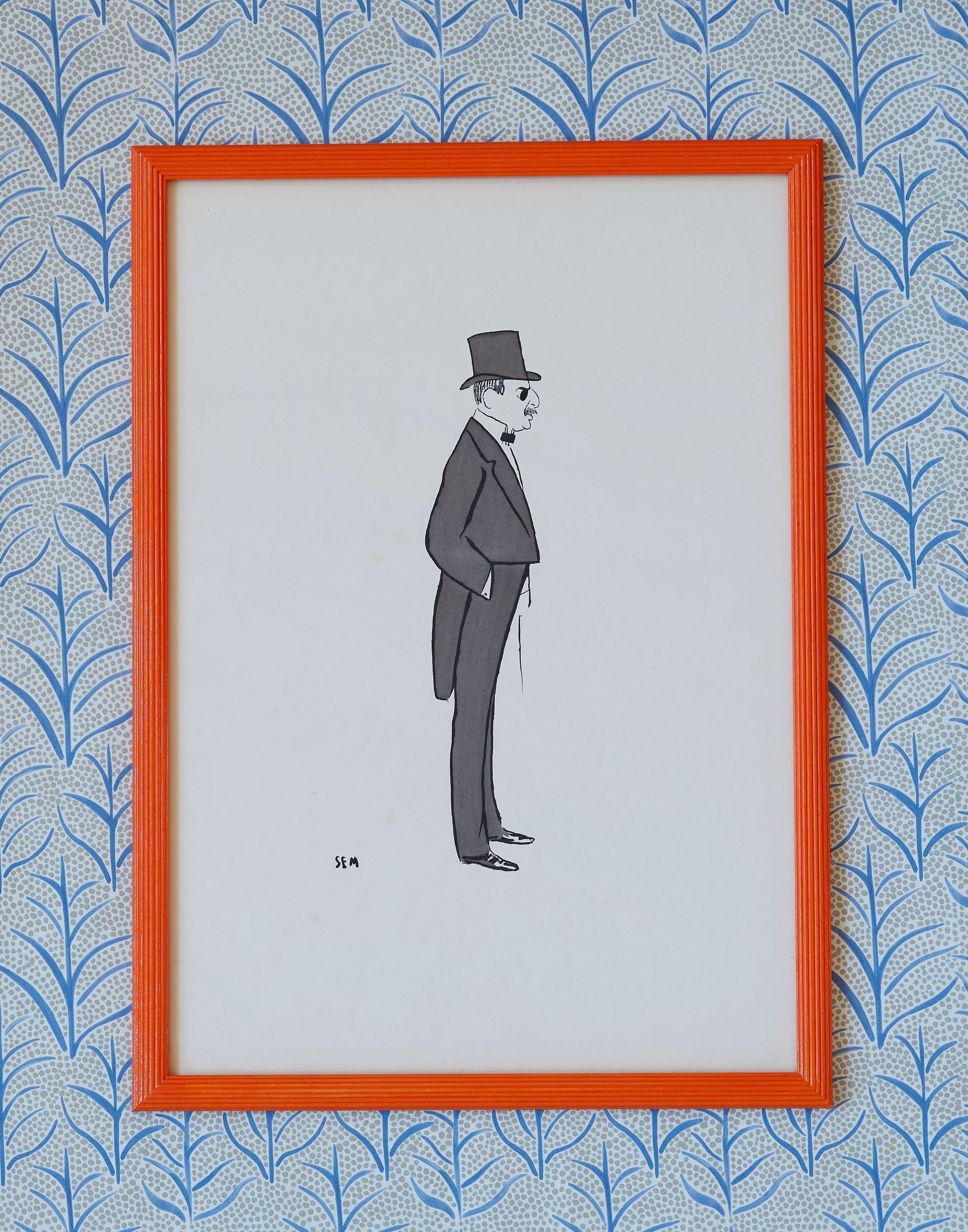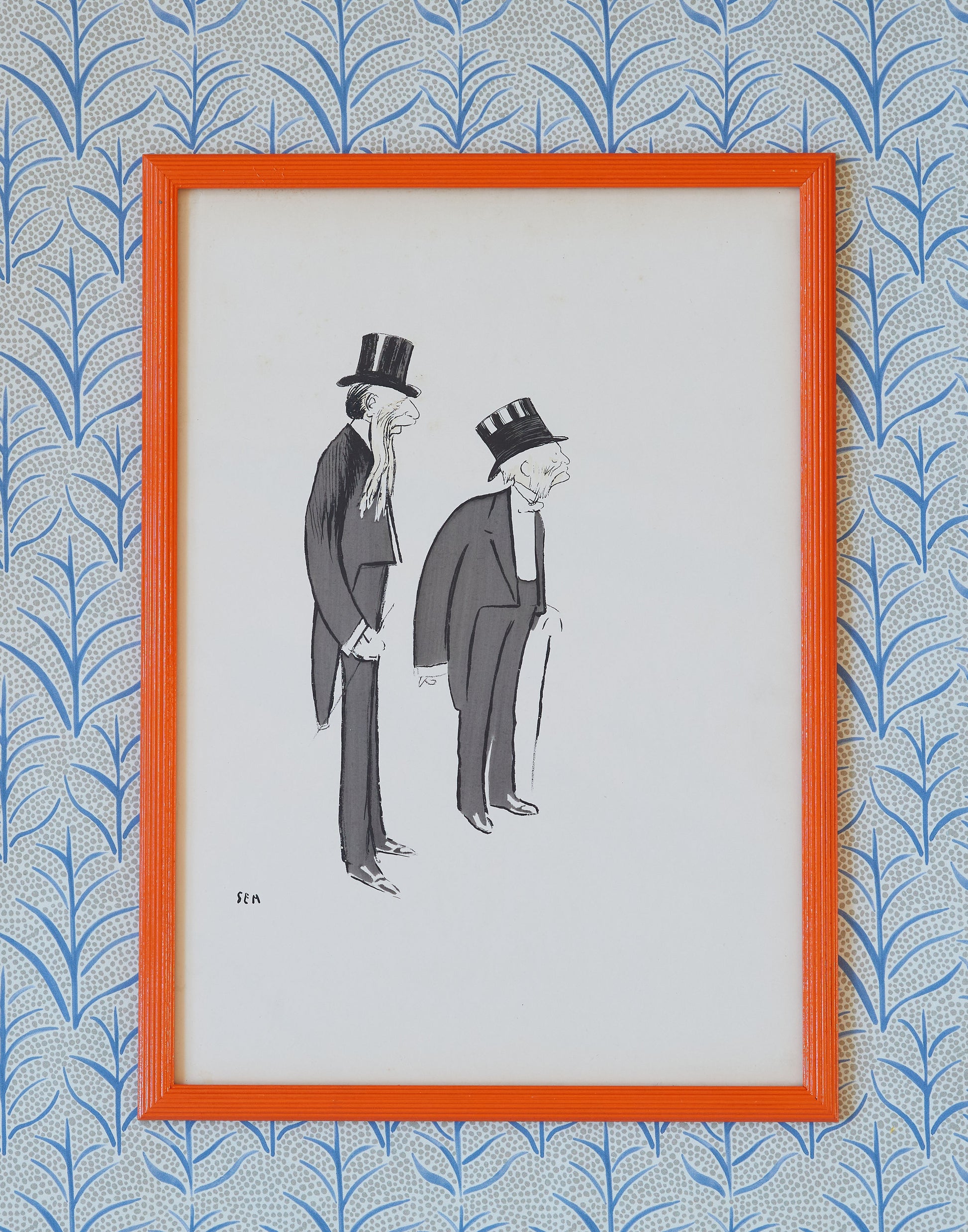A set of six early 20th century lithographs of caricatures by Georges Goursat (1863-1934), known as Sem framed in a reeded frame hand-painted in Hermes orange and non-reflective glass.