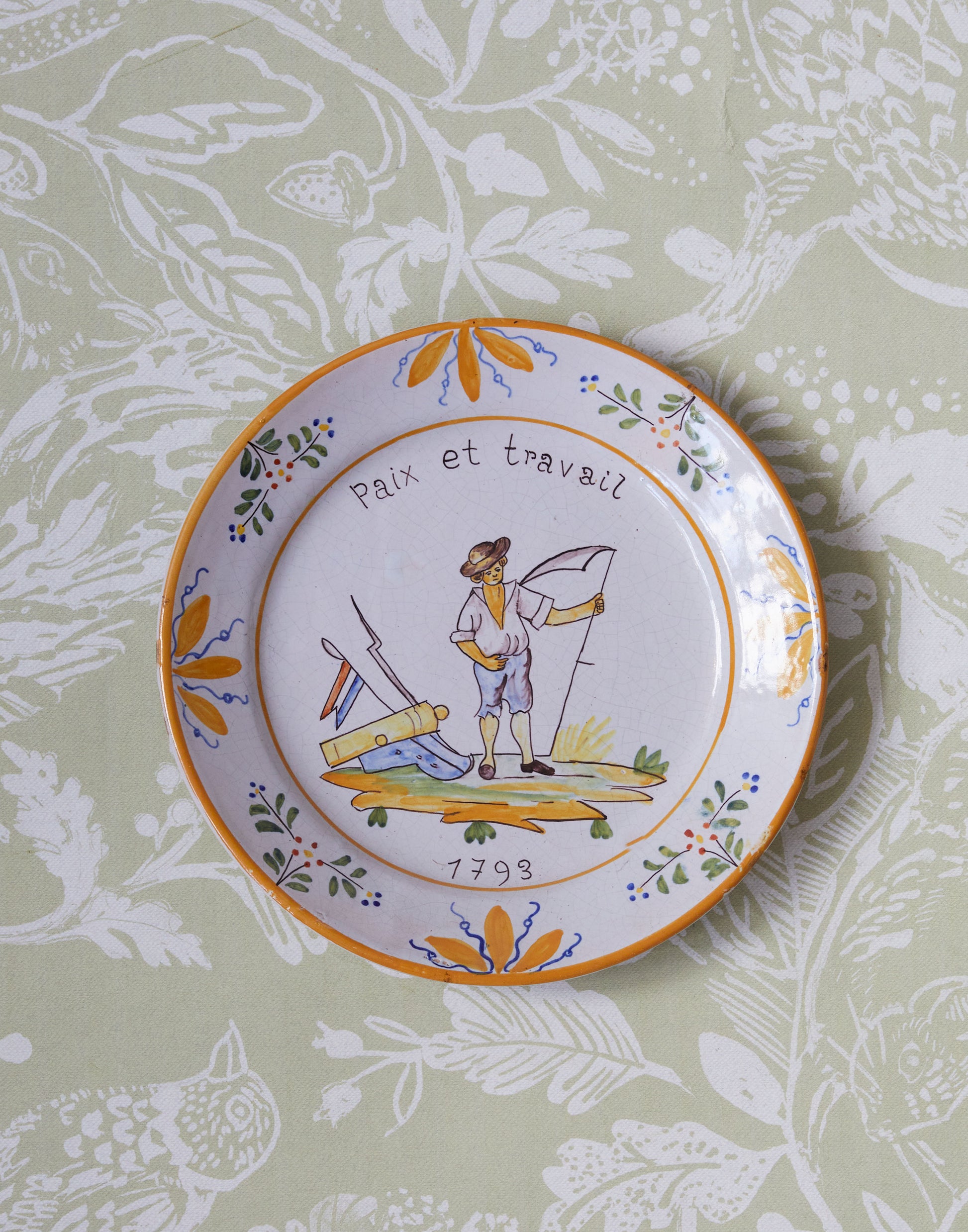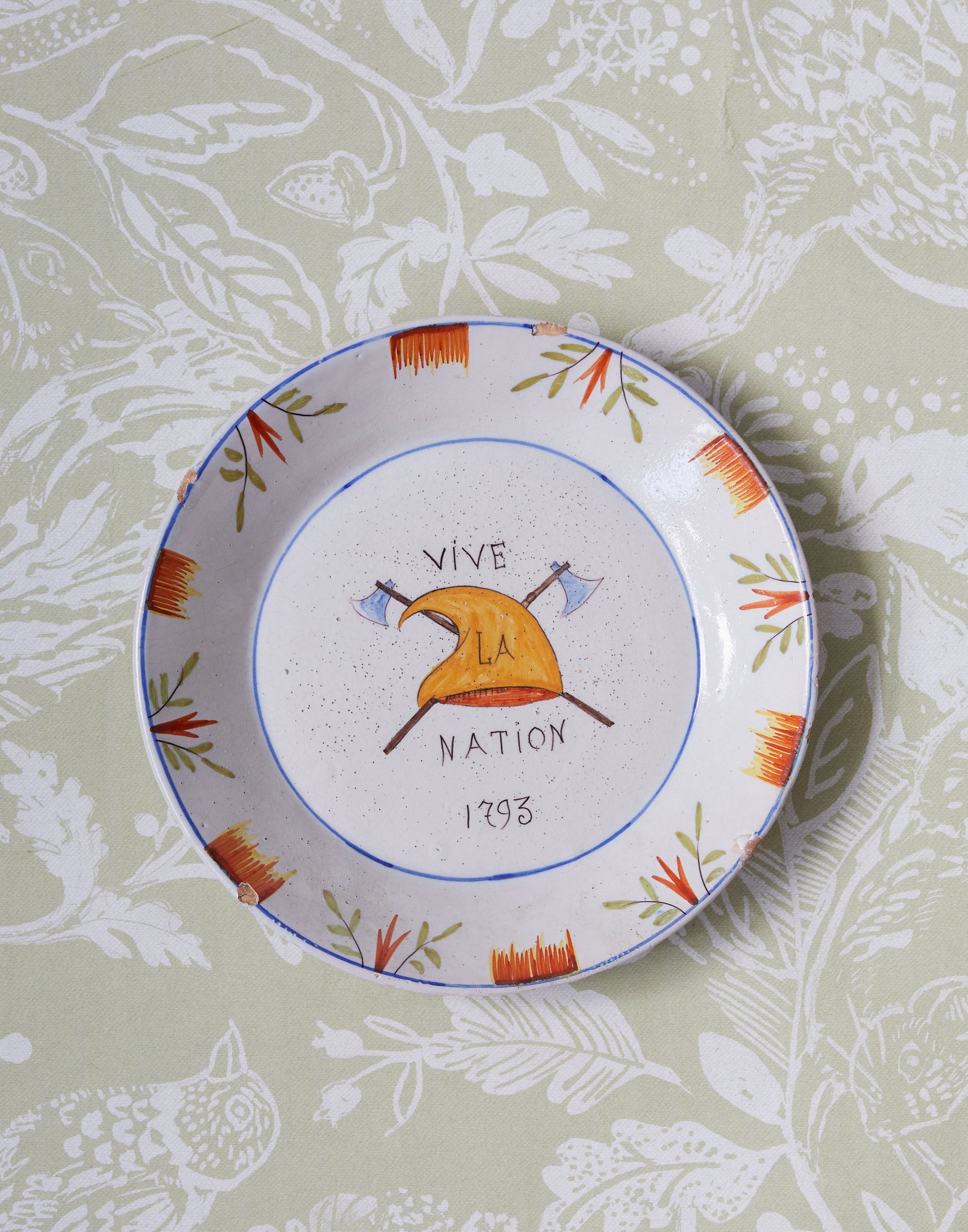 A set of three 19th century Nevers French Revolution faïence polychrome plates inscribed 'Paix et travail 1783', 'Vive Nation 1783' and 'A Ca Ira 1783'. The price is for the set.