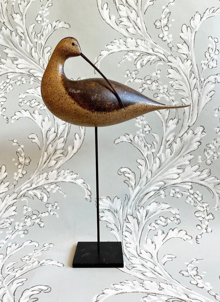 A wooden sculpture of a preening curlew on a stand by Michael Lythgoe. Signed and dated 'Michael Lythgoe/1992'. Each unique piece is hewn from blocks of wood using drawknives and spokeshaves and then sympathetically painted using acrylic paint.