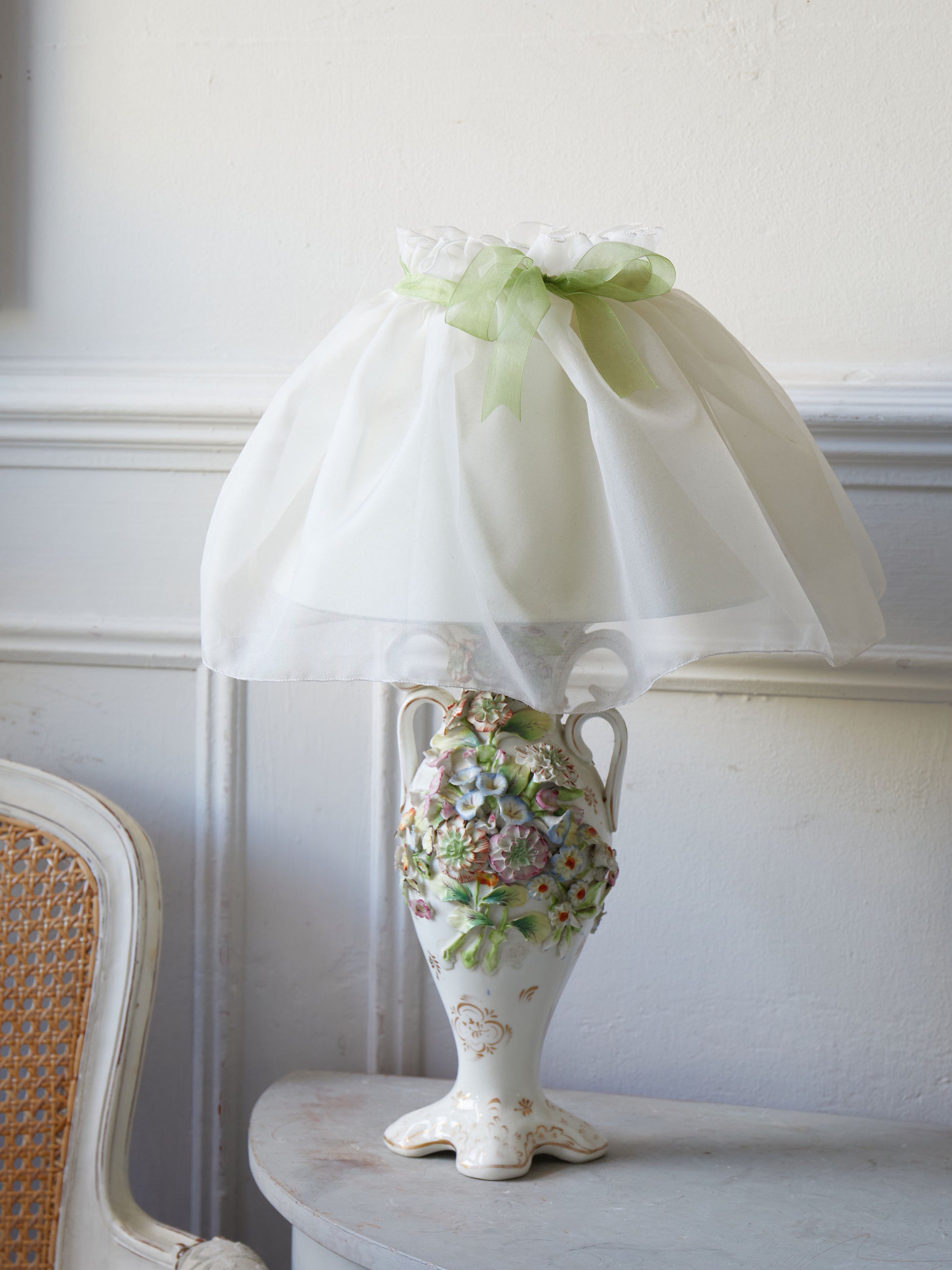 An applique ceramic lamp decorated with flowers with a hand-made organza shade. We had the lamp converted from a vase, so the wiring is brand new.