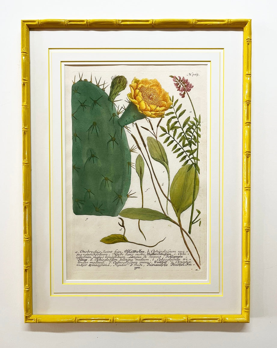 A pair of rare 18th century engravings of cacti by Johann Weinmann (1683-1741) presented in decorative double mounts with yellow accents and glossy yellow faux bamboo frames. The price is for the pair.