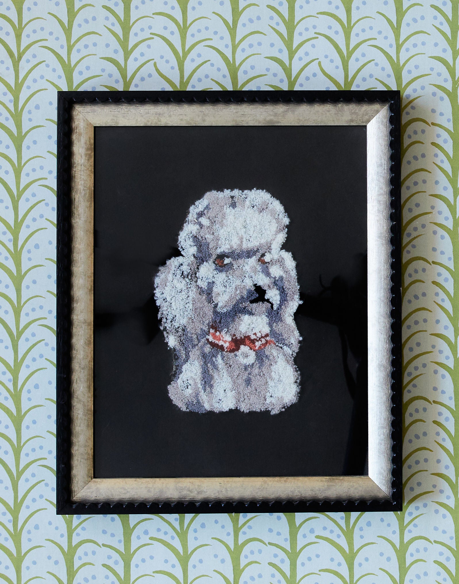 An antique embroidered poodle presented in a silver and black frame exclusive to Canford.