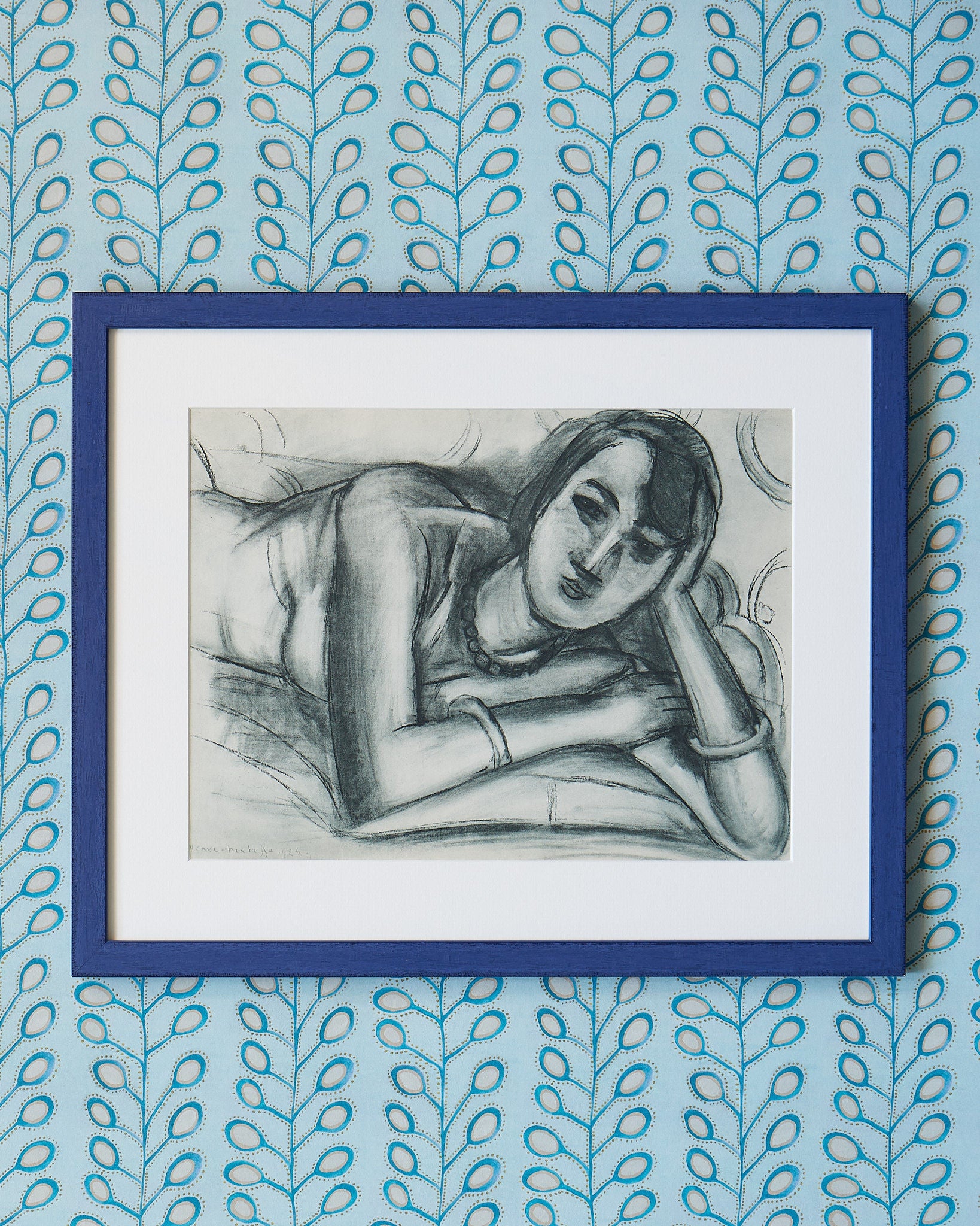 A lithograph print of a reclining woman after a drawing by Henri Matisse printed in Paris in the 1950's, presented in a mount and framed in navy lacquer.