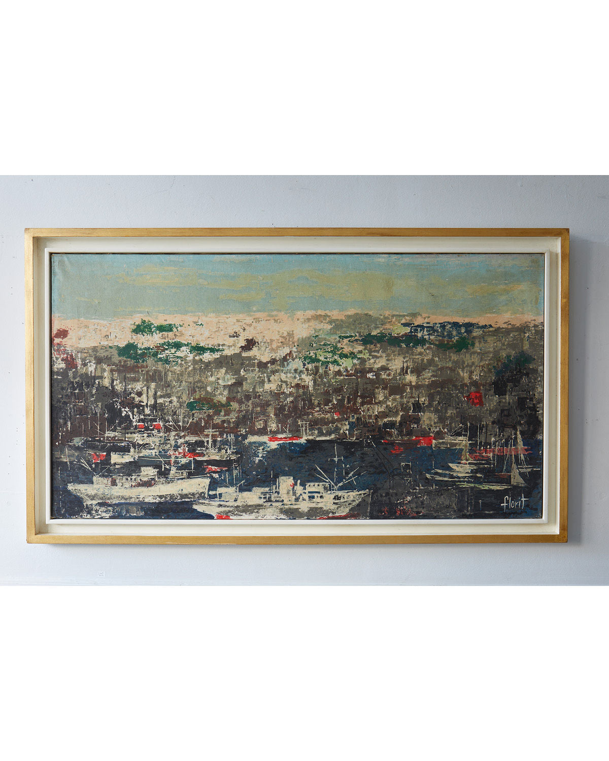 Harbour Scene by Jose Luis Florit (1909-2000), oil on canvas and signed 'Florit' (lower right). It is presented in an aged gold and ivory tray frame.