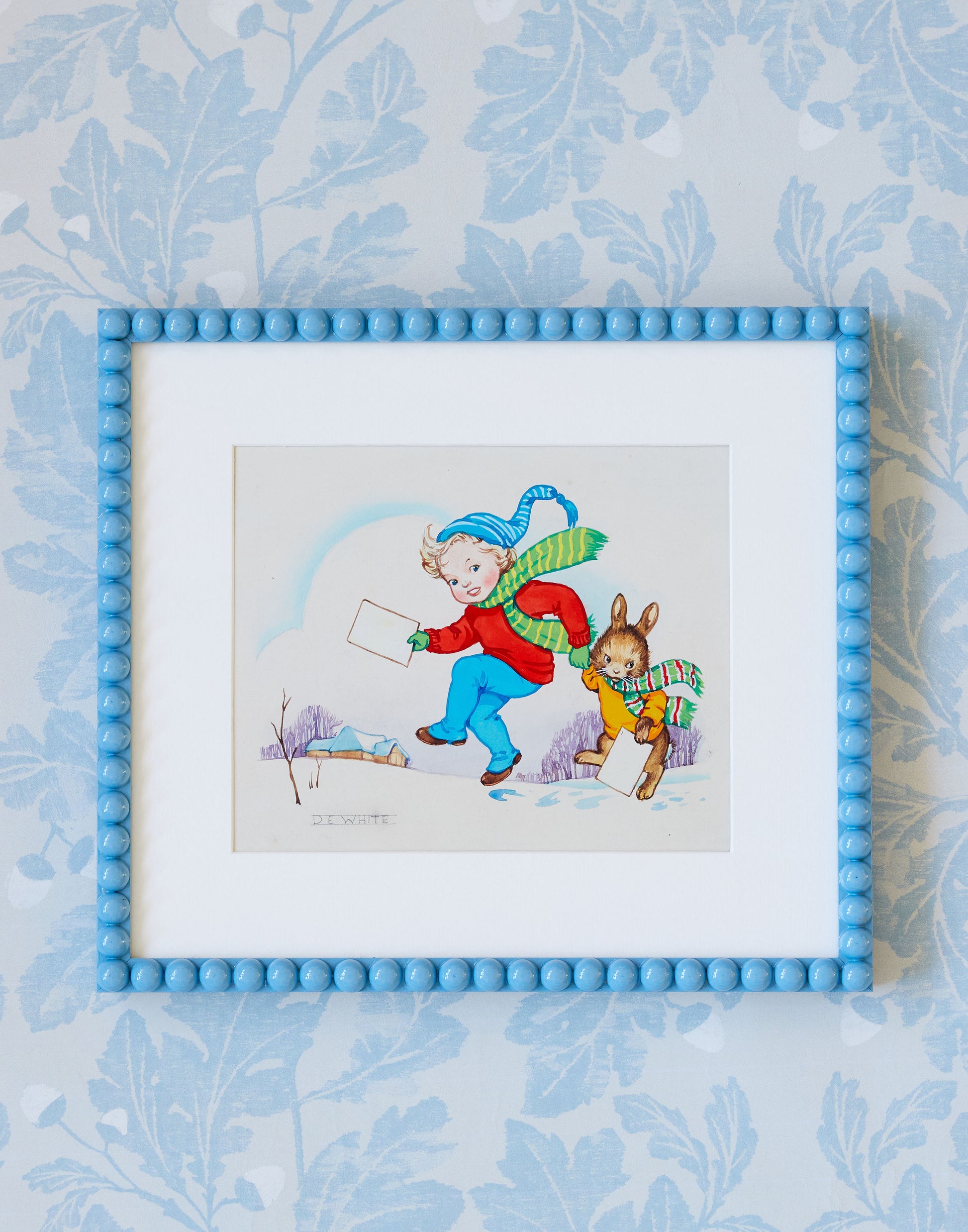 An original gouache watercolour of a child with a rabbit. It is presented in a mount and hand-painted bobble frame and artglass. It is signed D E WHITE (lower left)