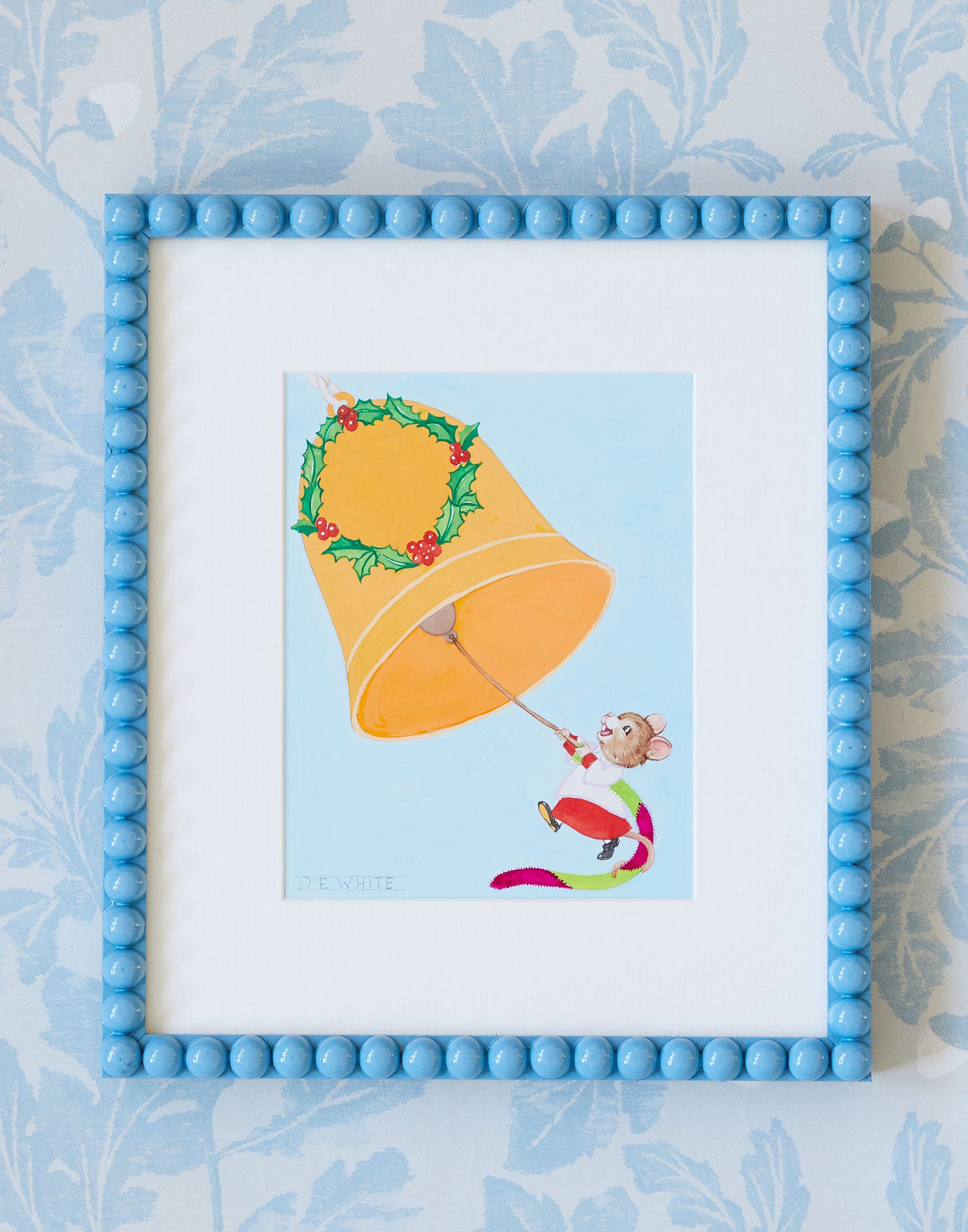 An original gouache watercolour of a mouse bell ringer, it is presented in a mount and hand-painted bobble frame with artglass. It is signed D E WHITE (lower left)