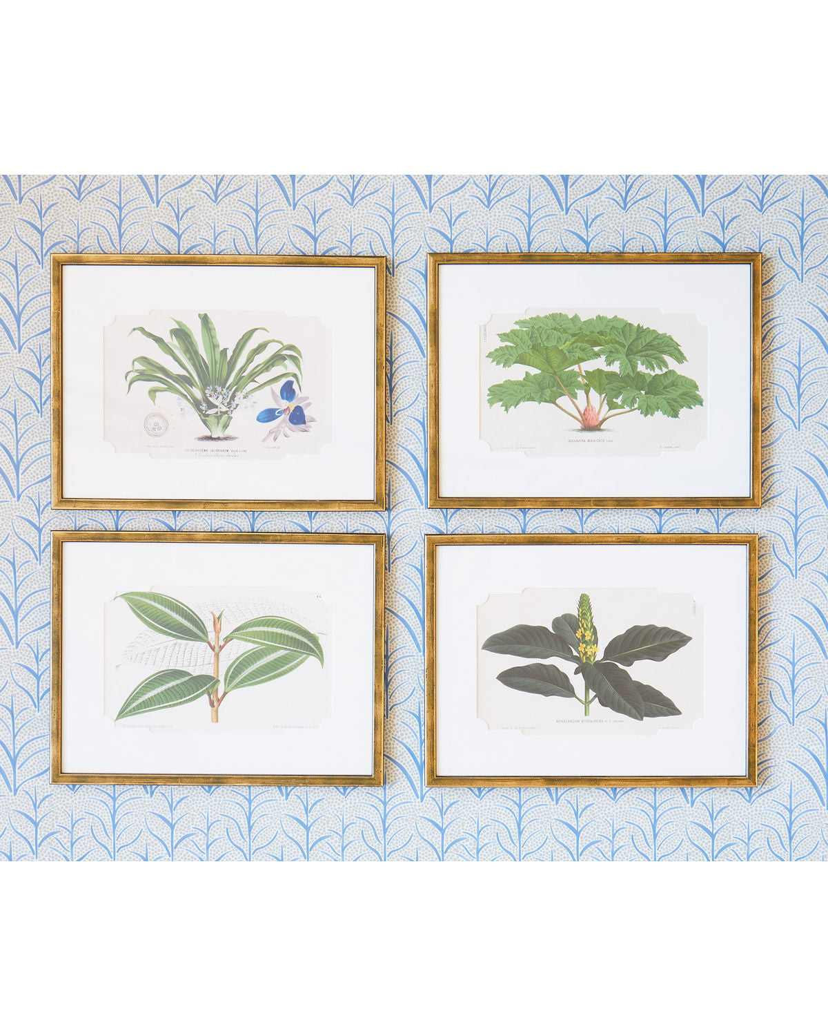 A set of four antique chromolithographs of exotic plants by Belgian naturalist, Peter de Pannemaeker. Presented in mounts cut with decorative corners and framed in a slim muted gold profile with dark green sides.