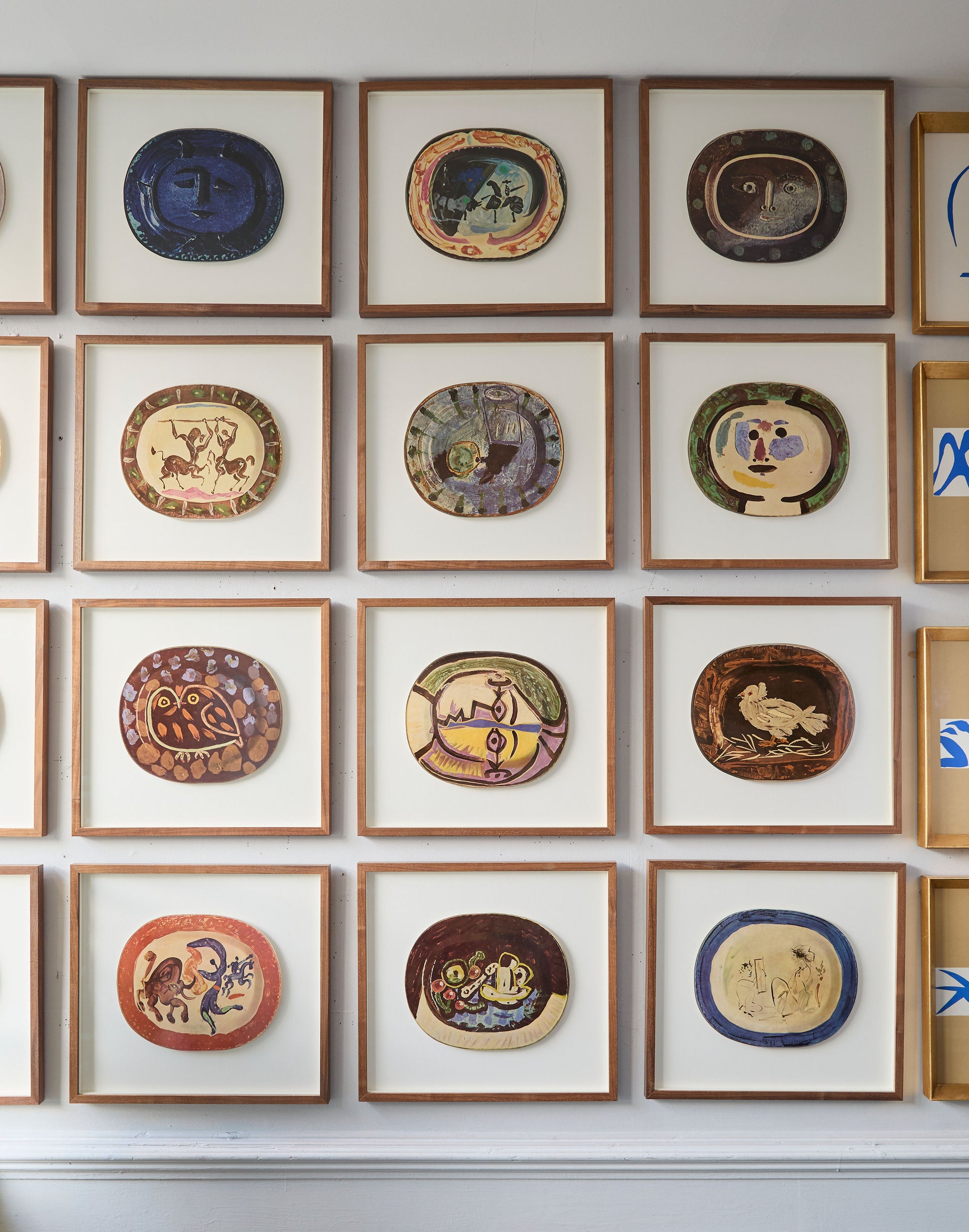 A set of eighteen polychrome prints after ceramic plates by Pablo Picasso from a rare limited edition Art Folio "Céramiques De Picasso" authored by Suzanne and Georges Ramié and published by Albert Skira in1959. Each print is in the shape of the ceramic plate and has a glossy finish that echoes the coloured ceramic glazes. We have suspended the artworks between two pieces of non-reflective glass to create the illusion of Picasso's ceramic plates on display in the Picasso Museum in Antibes (see image). They are framed in slim black walnut frames. The price is for the set,, but they are available individually for £750 each.