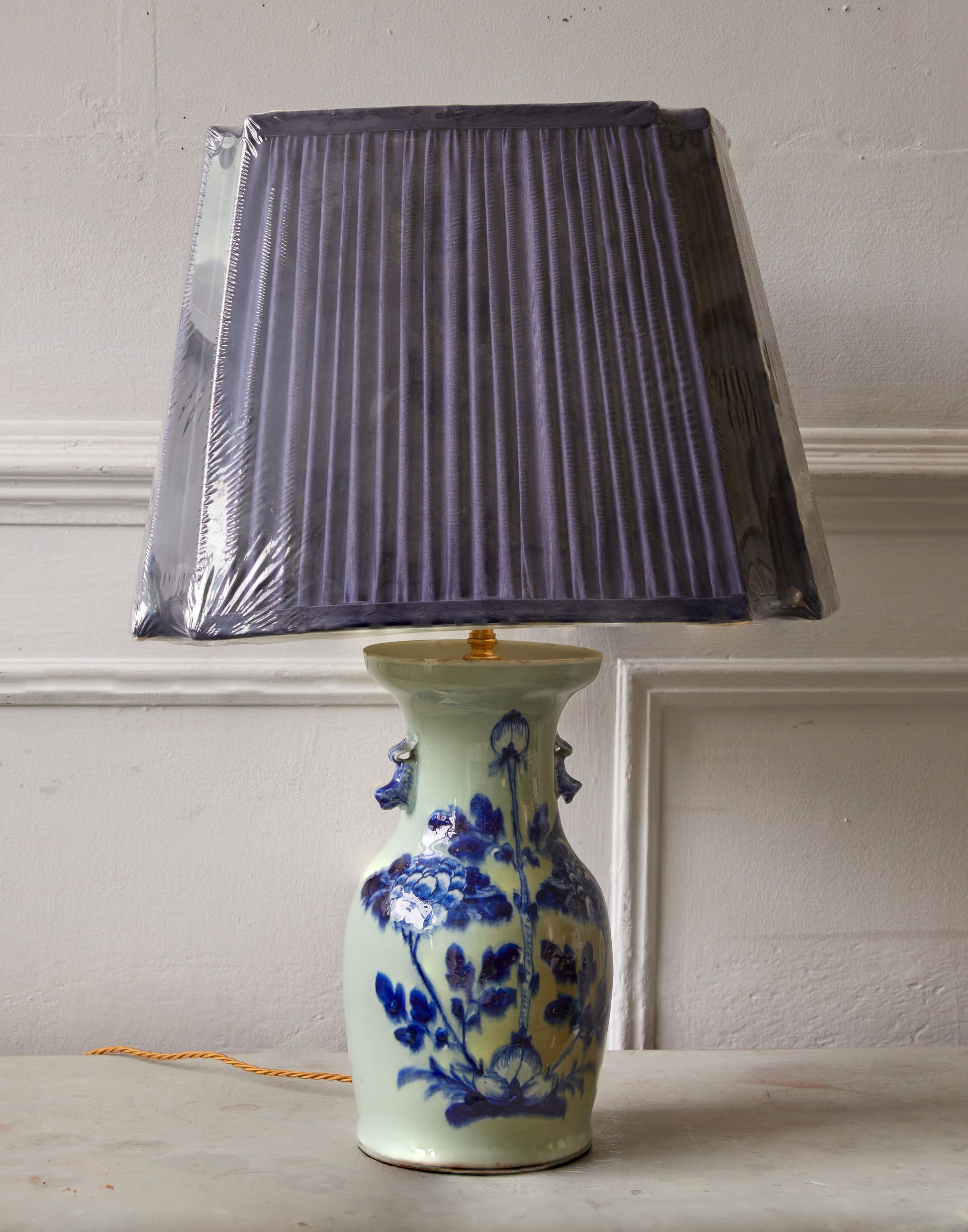 A large 19th century Chinese Blue and Celadon Porcelain Table Lamp with a pleated lamp shade. PAT tested.