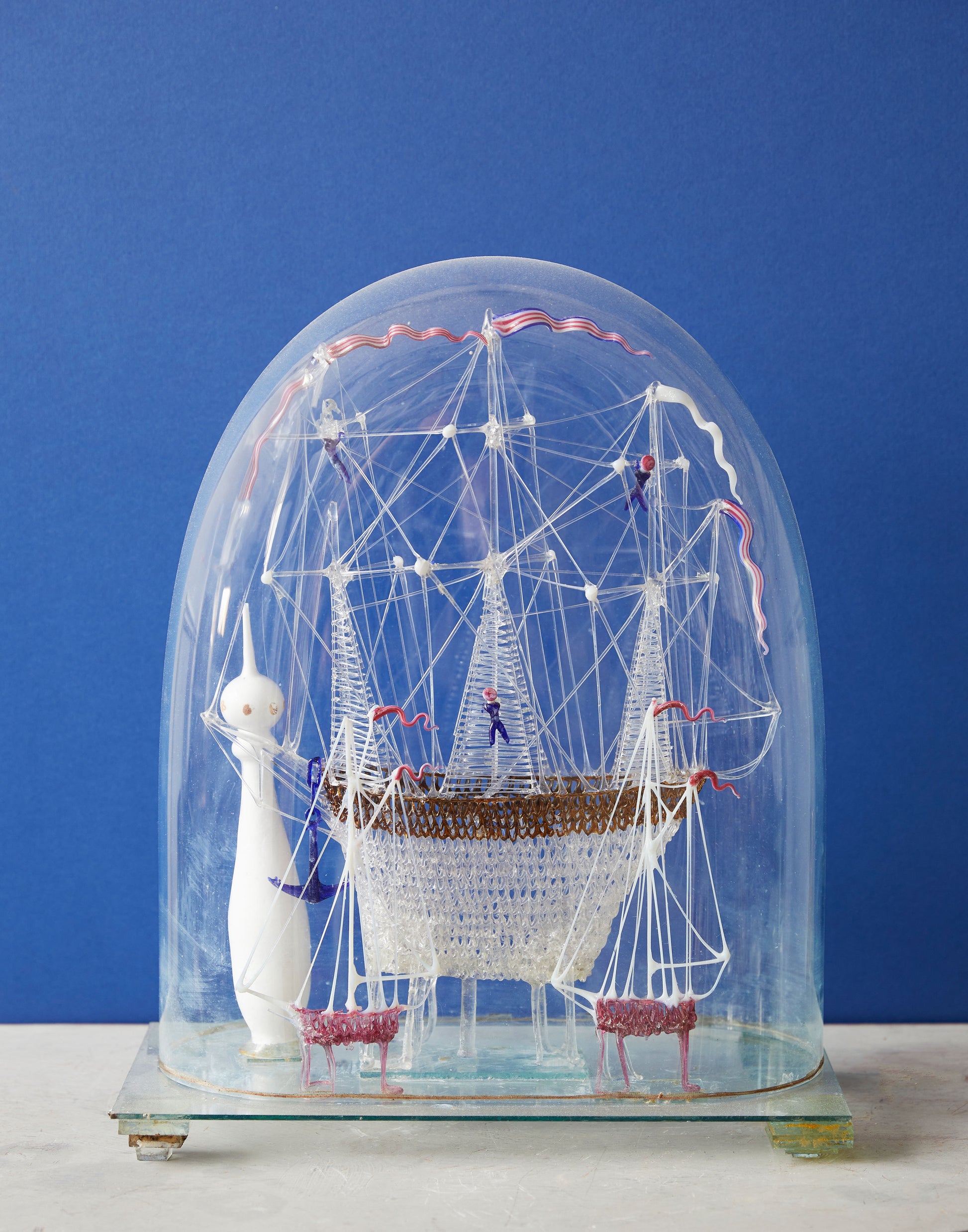 Two rare 19th century 'Nailsea' type spun glass friggers of three-masted galleons flanked by two smaller two-masted ships, sailors climing the rigging, anchors and a lighthouse within glass domes (one dome damaged).